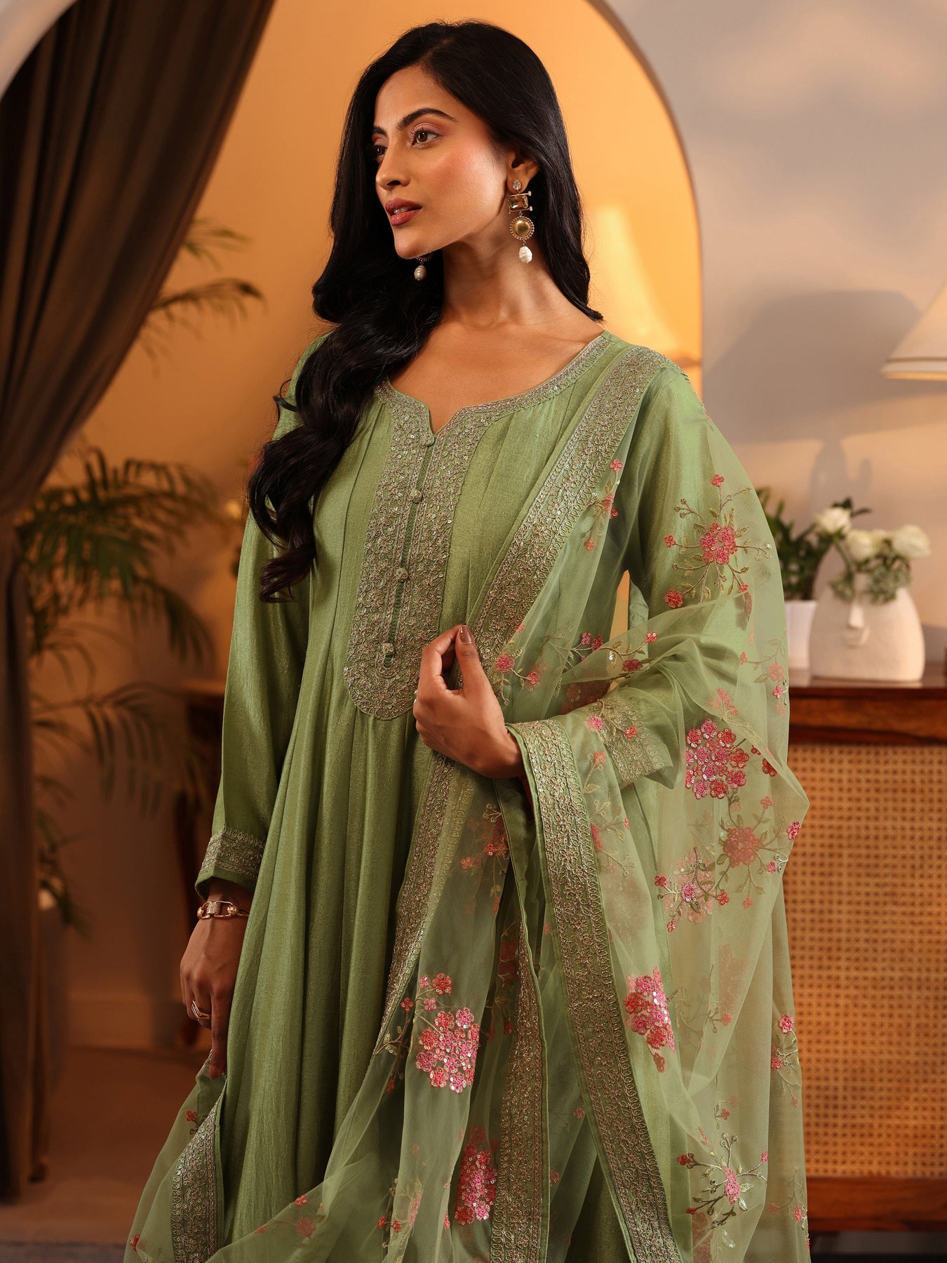 Our 3-piece green silk blend Anarkali kurta set features a round neckline, regular sleeves, and statement yoke design. Complemented with lining and straight pants with a partially elasticated waistband and 2 pockets, and an embroidered dupatta. Adorned with embroidered accents, this style is perfect for festive wear.