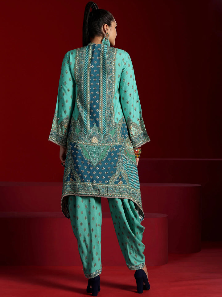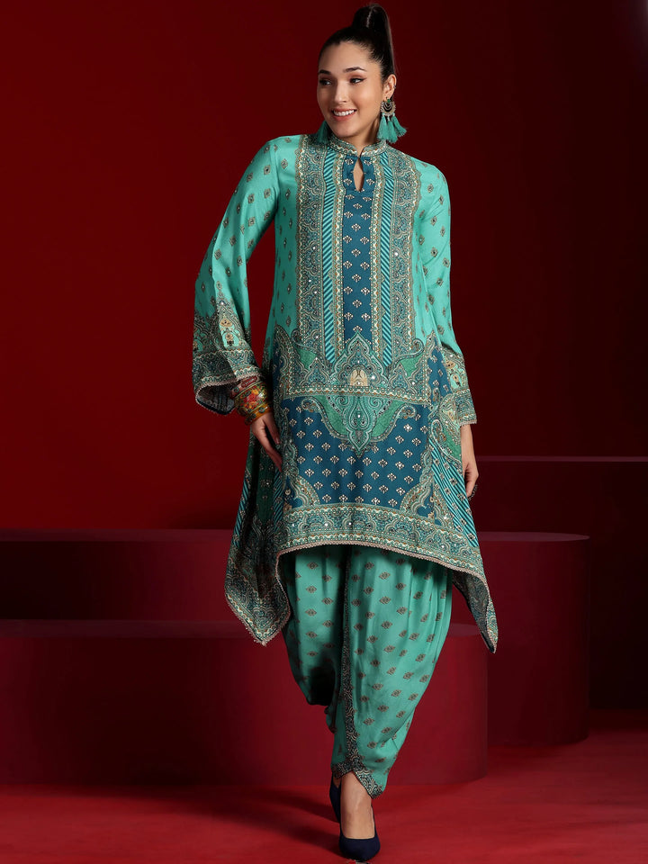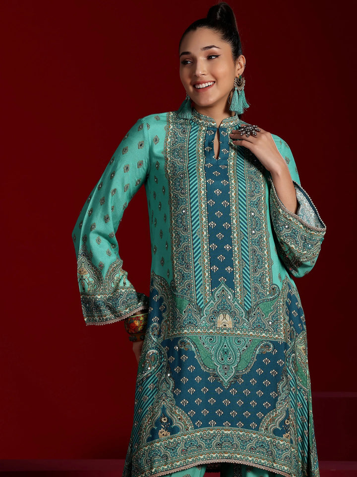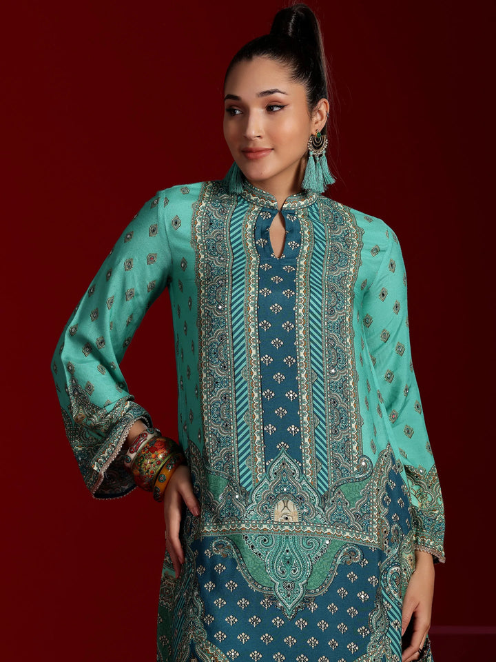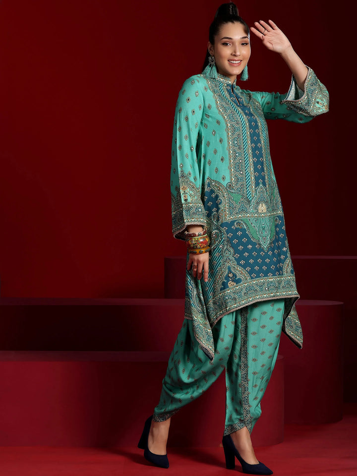 Our 2-piece Turquoise Blue printed Muslin co-ord set features an Asymmetric Hemline Tunic with a Mandarin Collar neckline and Long Sleeves. Complemented with matching Salwar with an Elasticated waistband. Highlighted with Printed, this style is perfect for Festive occasions.