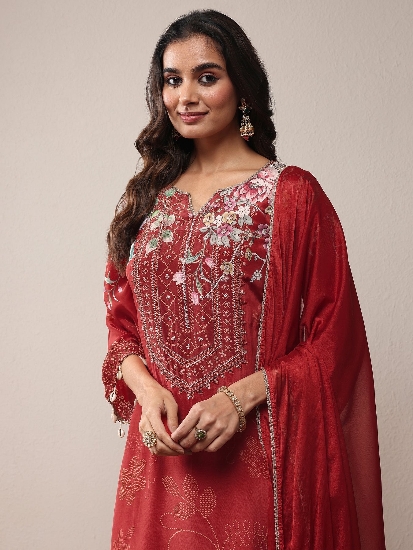Our 3-piece Red Crepe Straight-Fit Kurta Set features a V-Neckline, Regular Sleeves, and statement yoke. Complemented with Straight Pants with a Partially Elasticated waistband and 2 pockets, and a Solid dupatta. Adorned with bandhani printed this style is perfect for Festive occasions.