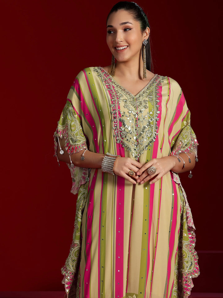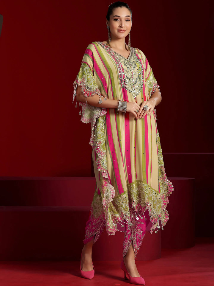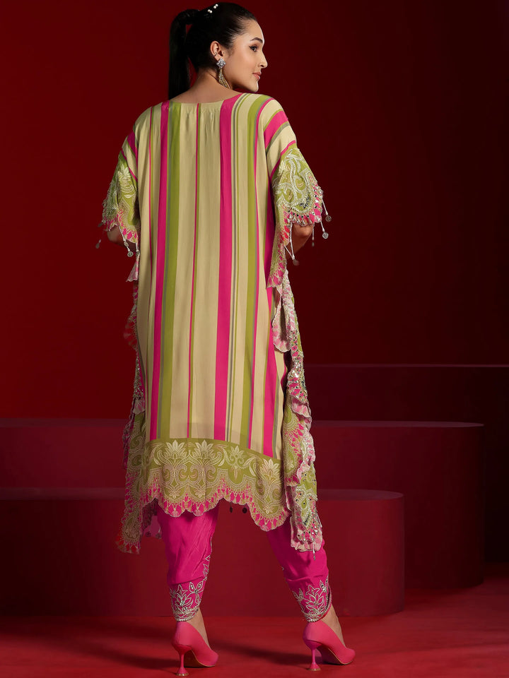Our 2-piece multi printed silk blend co-ord set features a straight-fit tunic with a V-neck neckline and short sleeves. Complemented with matching dhoti pant with an elasticated waistband. Highlighted with printed, this style is perfect for festive occasions.