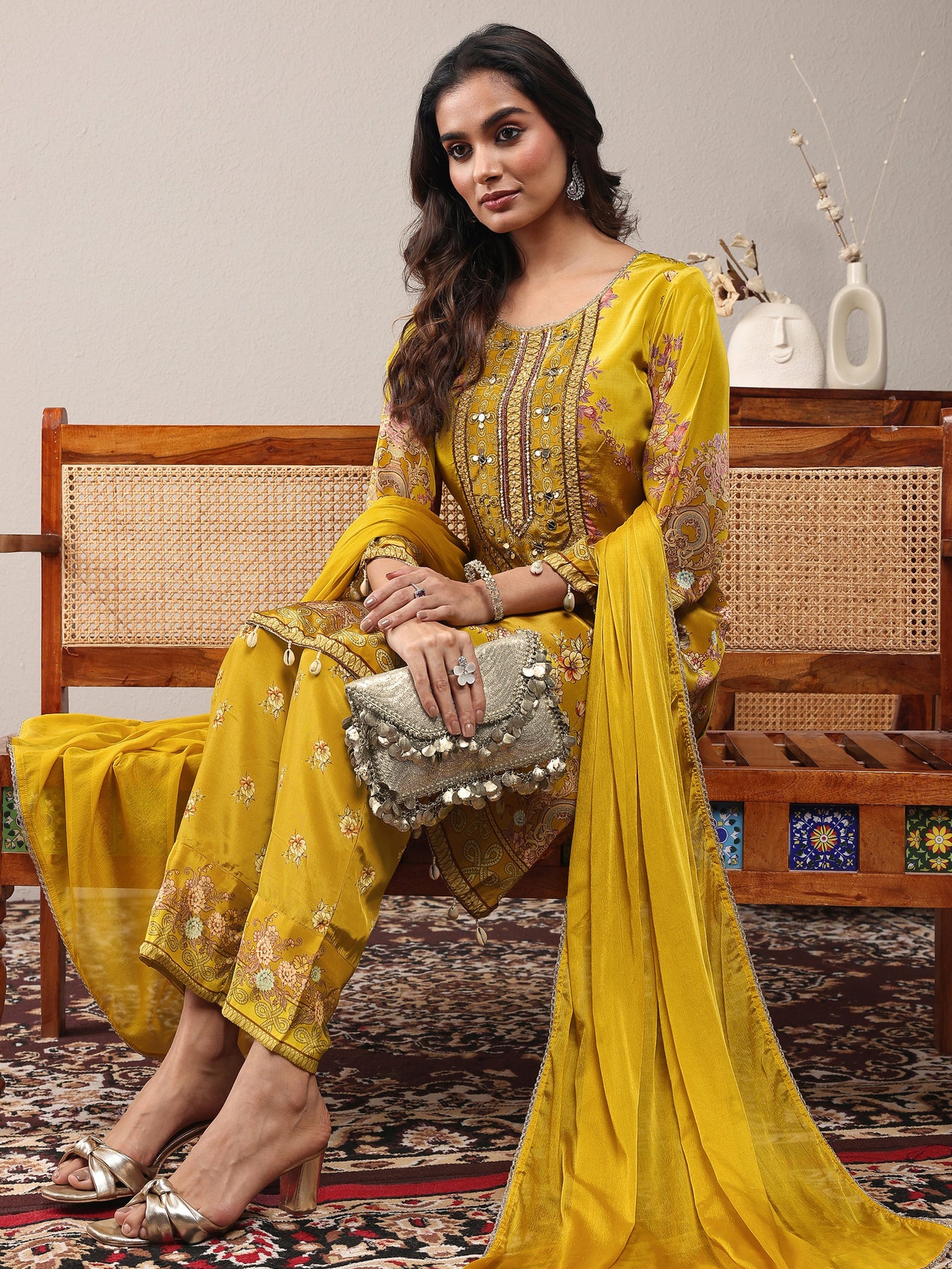 Libas Art Mustard Printed Silk Crepe Straight Suit Set With Dupatta