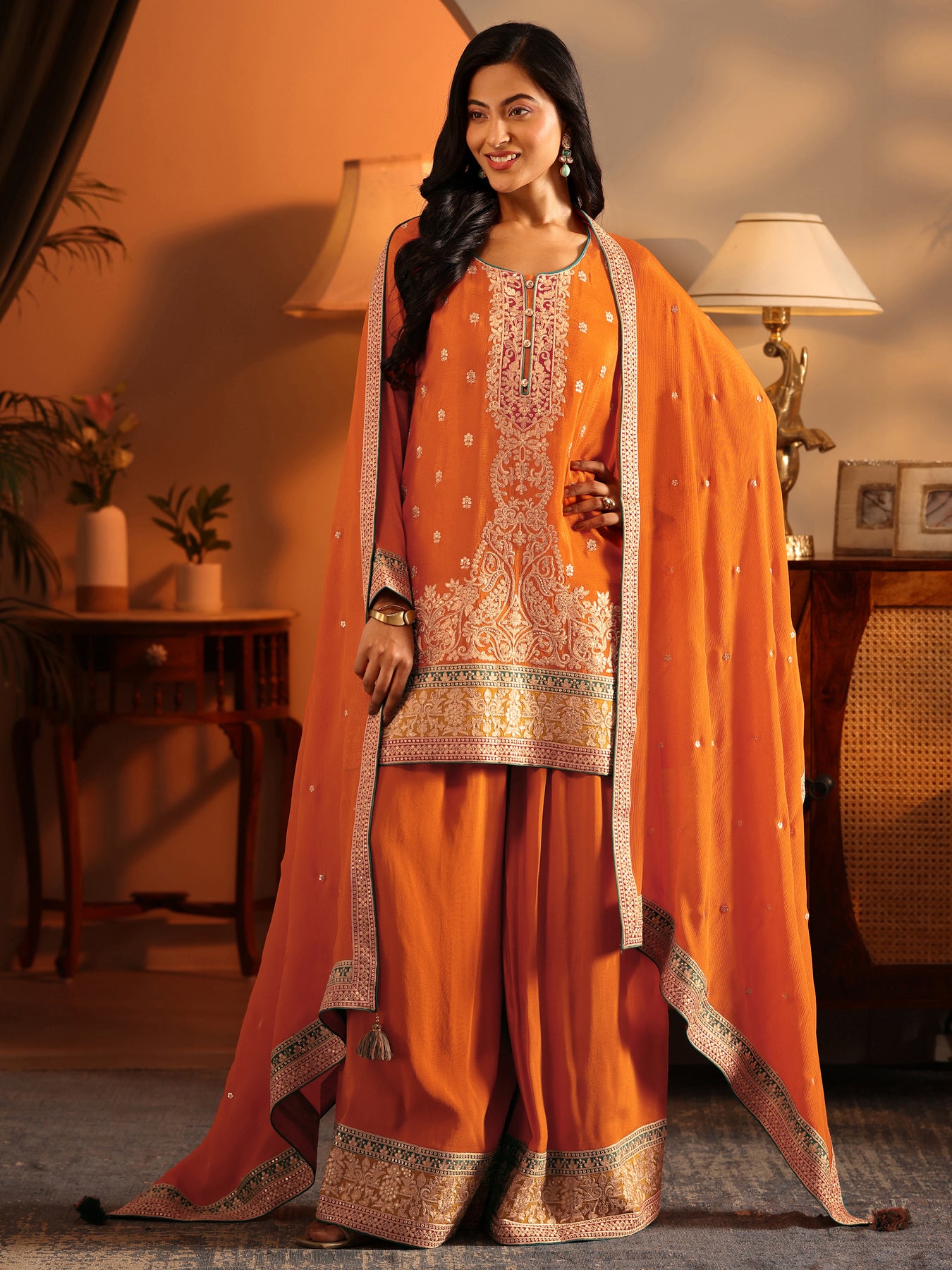 Libas Art Orange Embroidered Chinon Straight Suit Set With Dupatta