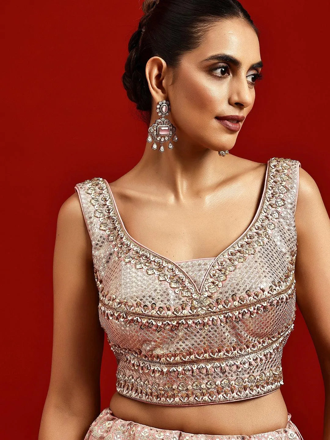 Our 3-piece pink embellished silk blend lehenga set features a sleeveless blouse with a sweetheart neckline. Complemented with a flared lehenga with drawstring closure, and a dupatta. Adorned with intricate thread work, beaded accents, sequins, and tassels, this style is perfect for festive celebrations.