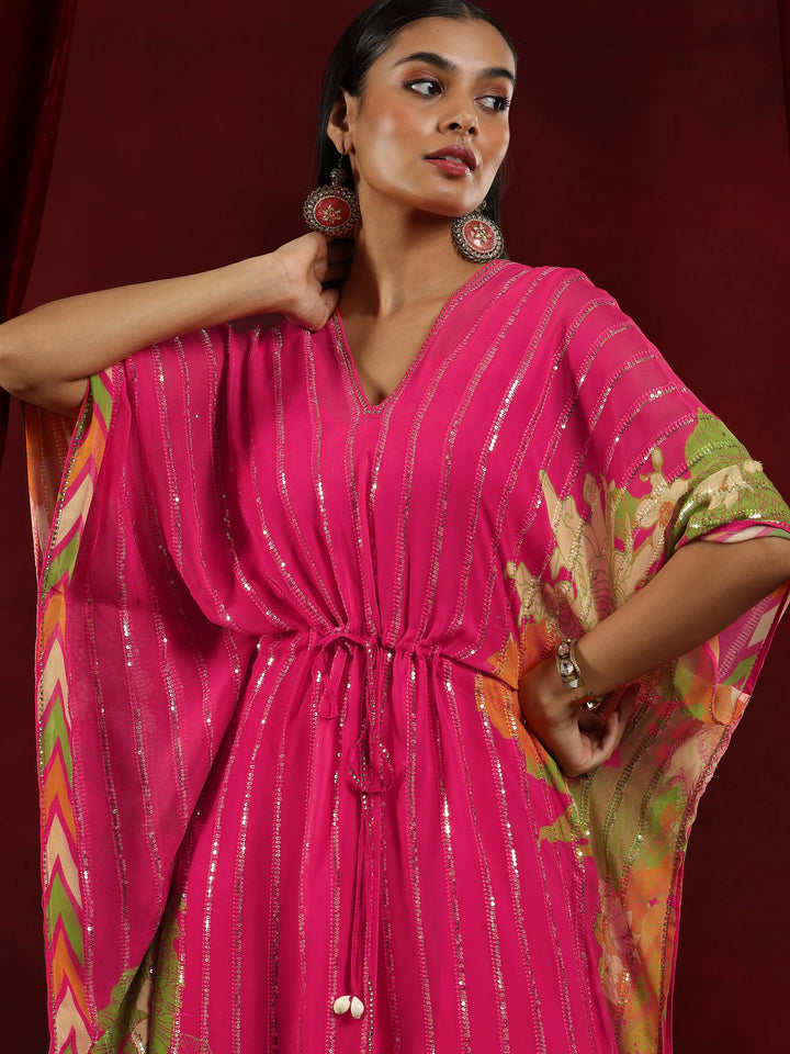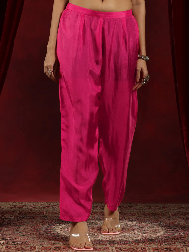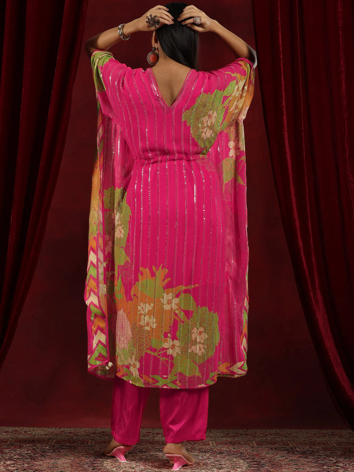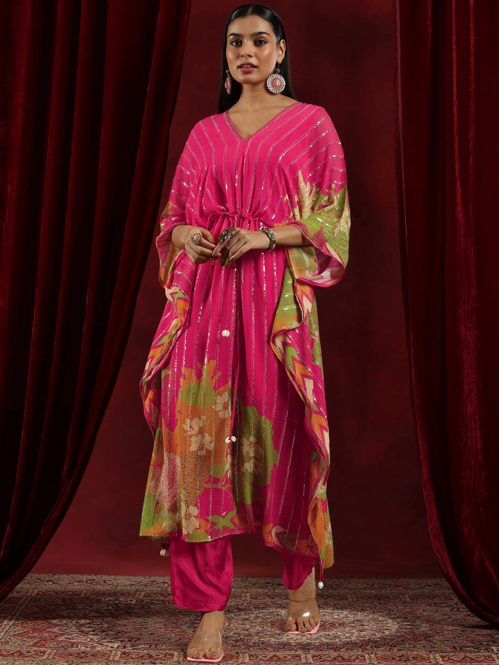 Our 2-piece Pink printed Poly Georgette co-ord set features a Straight-fit Tunic with a V-Neck neckline and Three-quarter sleeves. Complemented with matching Palazzos with an Elasticated waistband. Highlighted with Printed, this style is perfect for Festive.