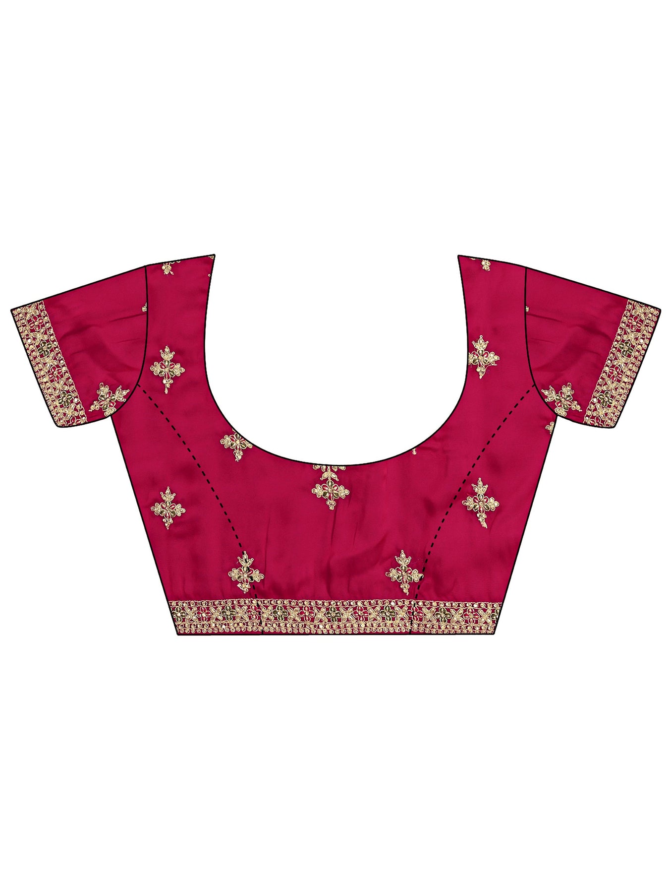 Our pink silk-blend saree features a smooth, satiny finish adorned with a bold scalloped embroidery border featuring intricate multi-colored threadwork. Complemented with unstitched blouse, this graceful saree is perfect for festive occasions and traditional celebrations.