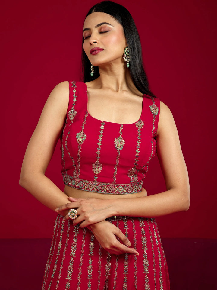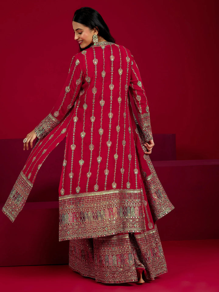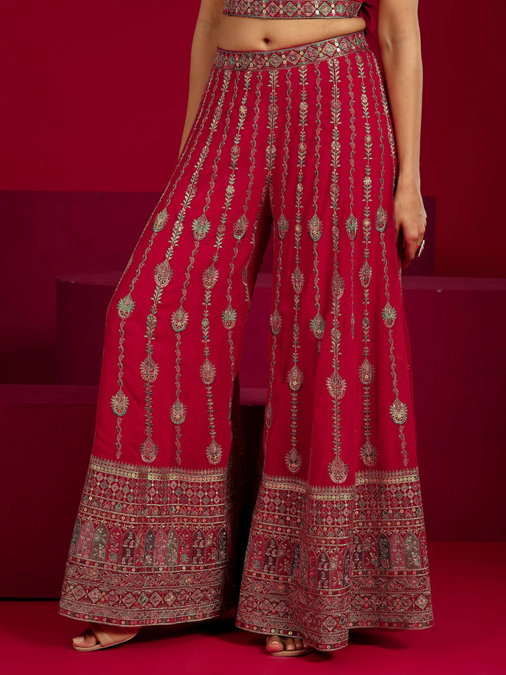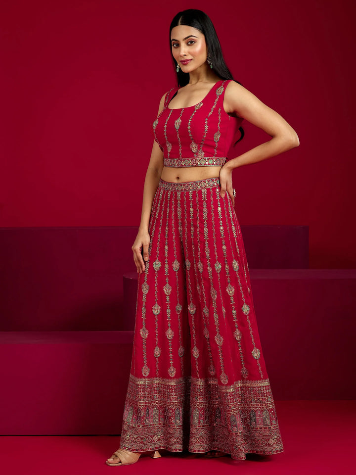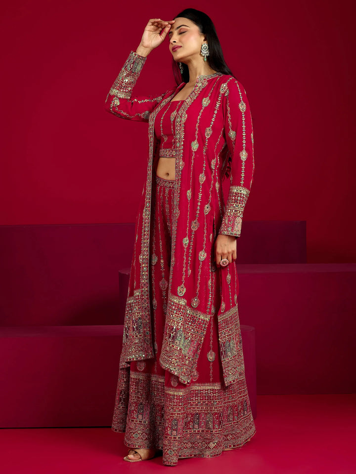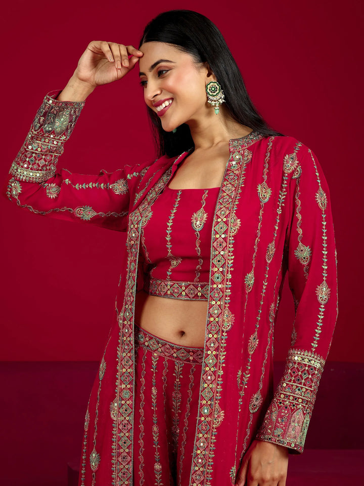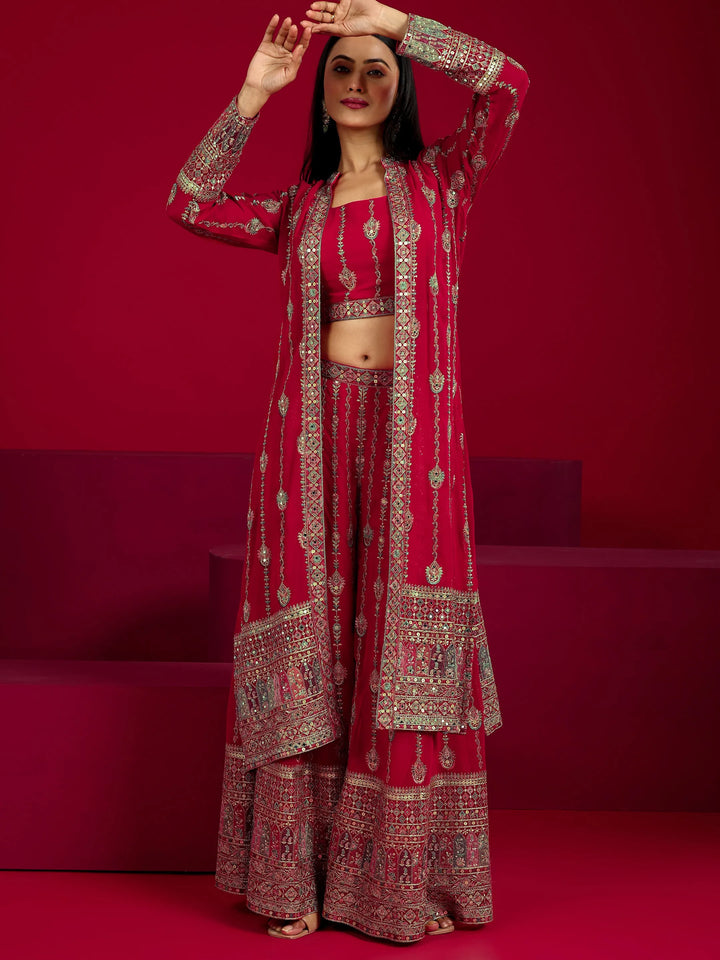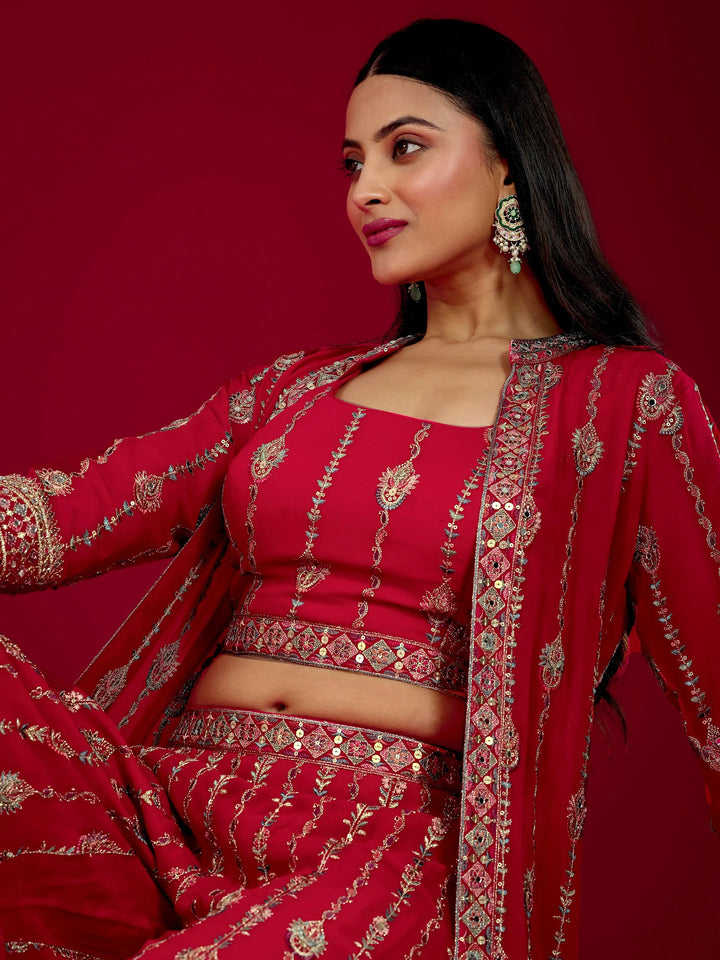 Our 3-piece pink embroidered georgette co-ord set features a sleeveless crop to with a round neckline. Complemented with flared palazzos with a partially elasticated waistband and a longline shrug. Highlighted with intricate thread work, this style is perfect for festive celebrations.