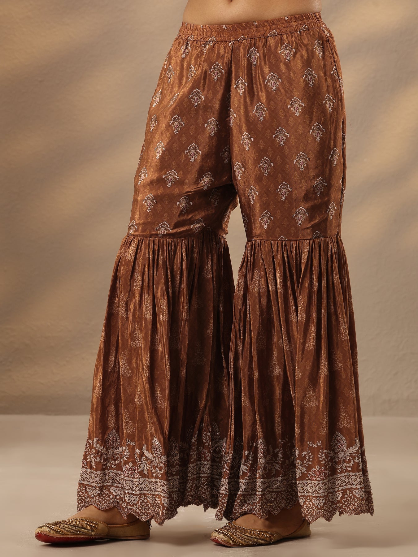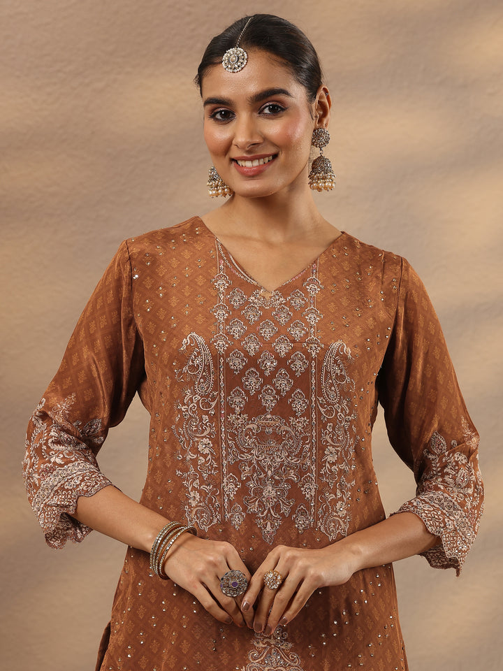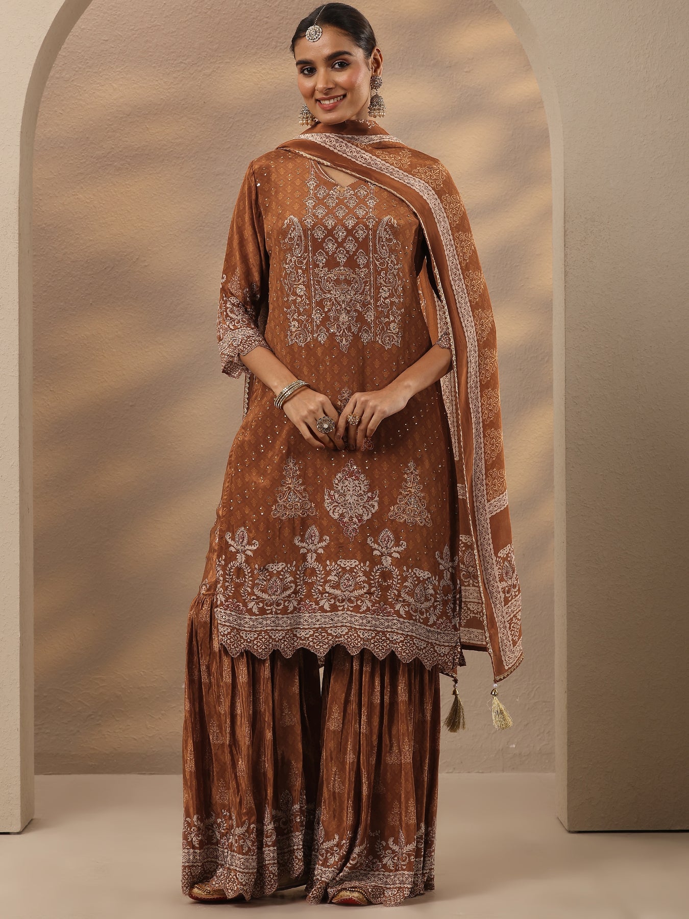 Our 3-piece brown crepe kurta set features a straight-fit kurta with a keyhole neckline, regular sleeves, and statement yoke. Complemented with lining and sharara pants with a partially elasticated waistband, and an embroidered dupatta. Adorned with embellished, this style is perfect for dark festive occasions.