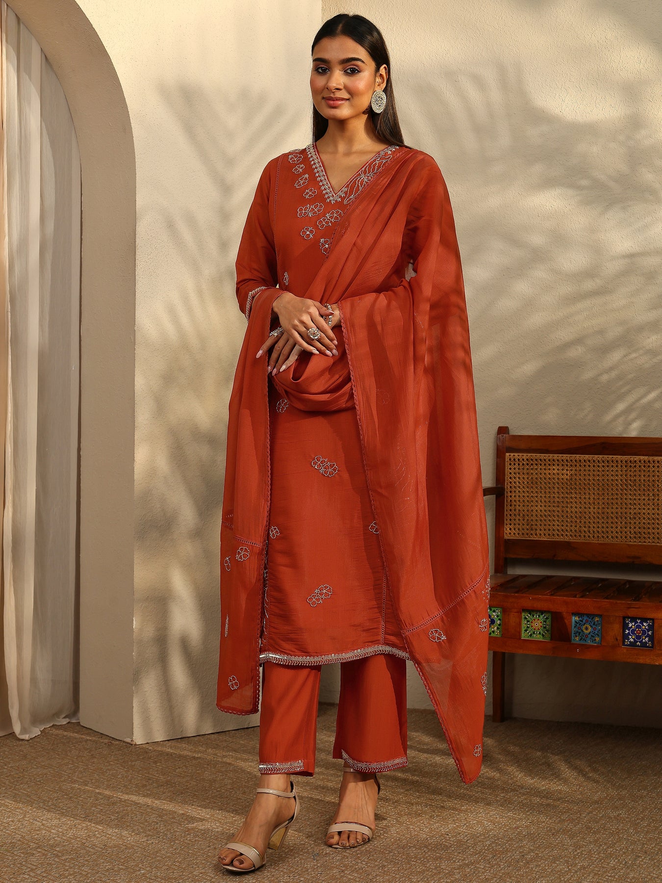 Our 3-piece rust silk blend straight-fit kurta set features a V-neckline, regular sleeves, and statement yoke. Complemented with straight pants with a partially elasticated waistband and 2 pockets, and an embroidered dupatta. Adorned with embellished, this style is perfect for dark festive occasions.