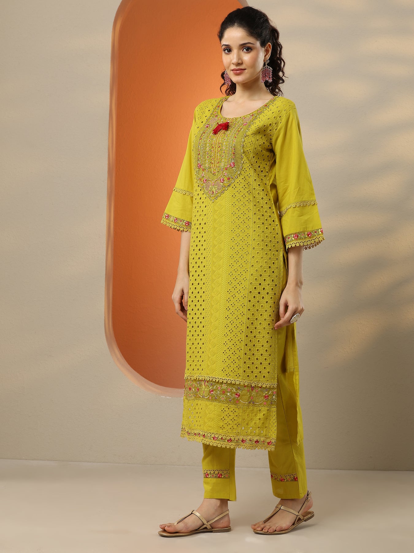 Lime Green Embroidered Cotton Straight Suit Set With Dupatta