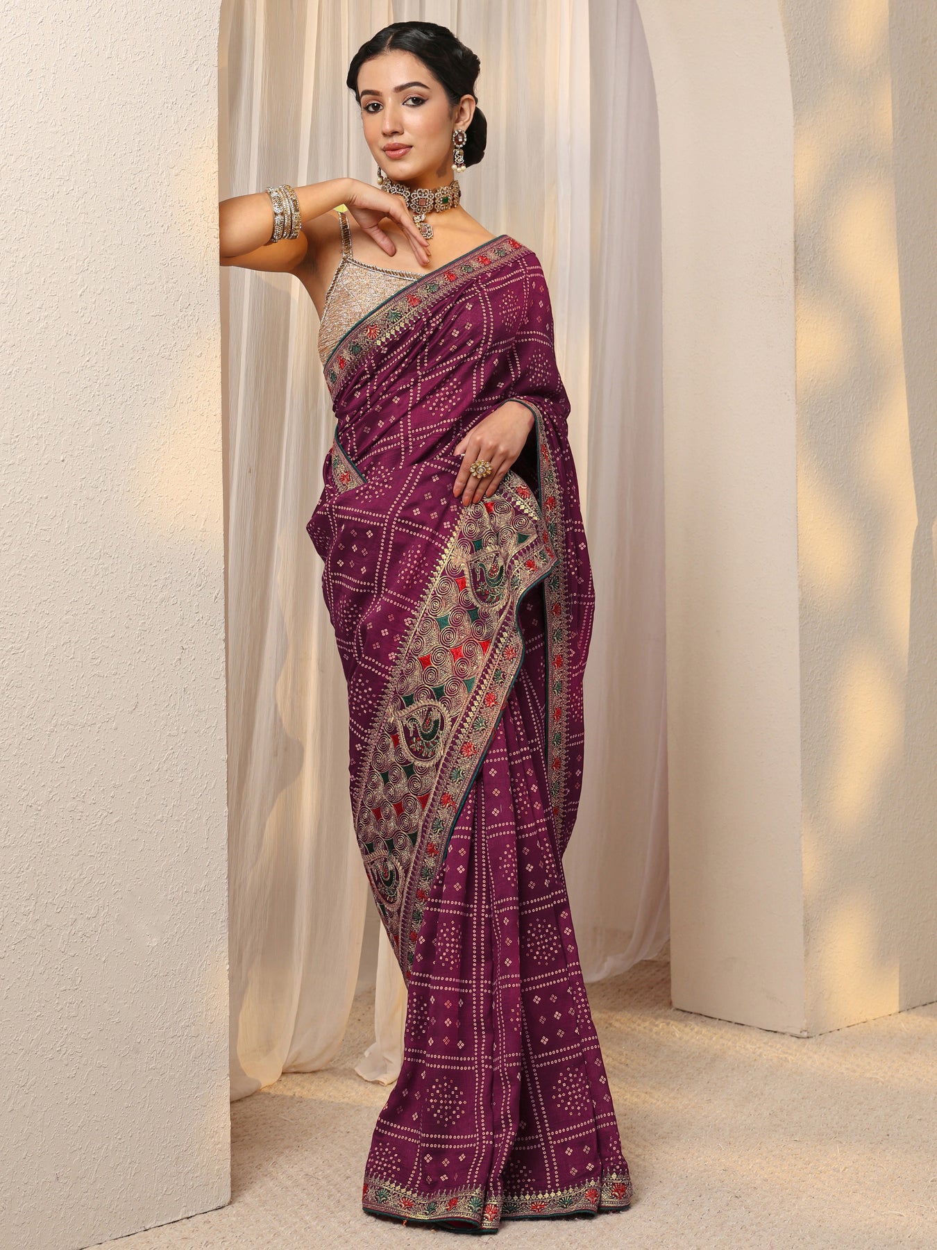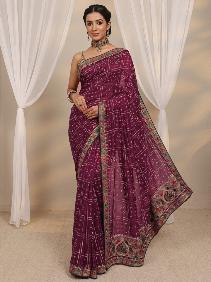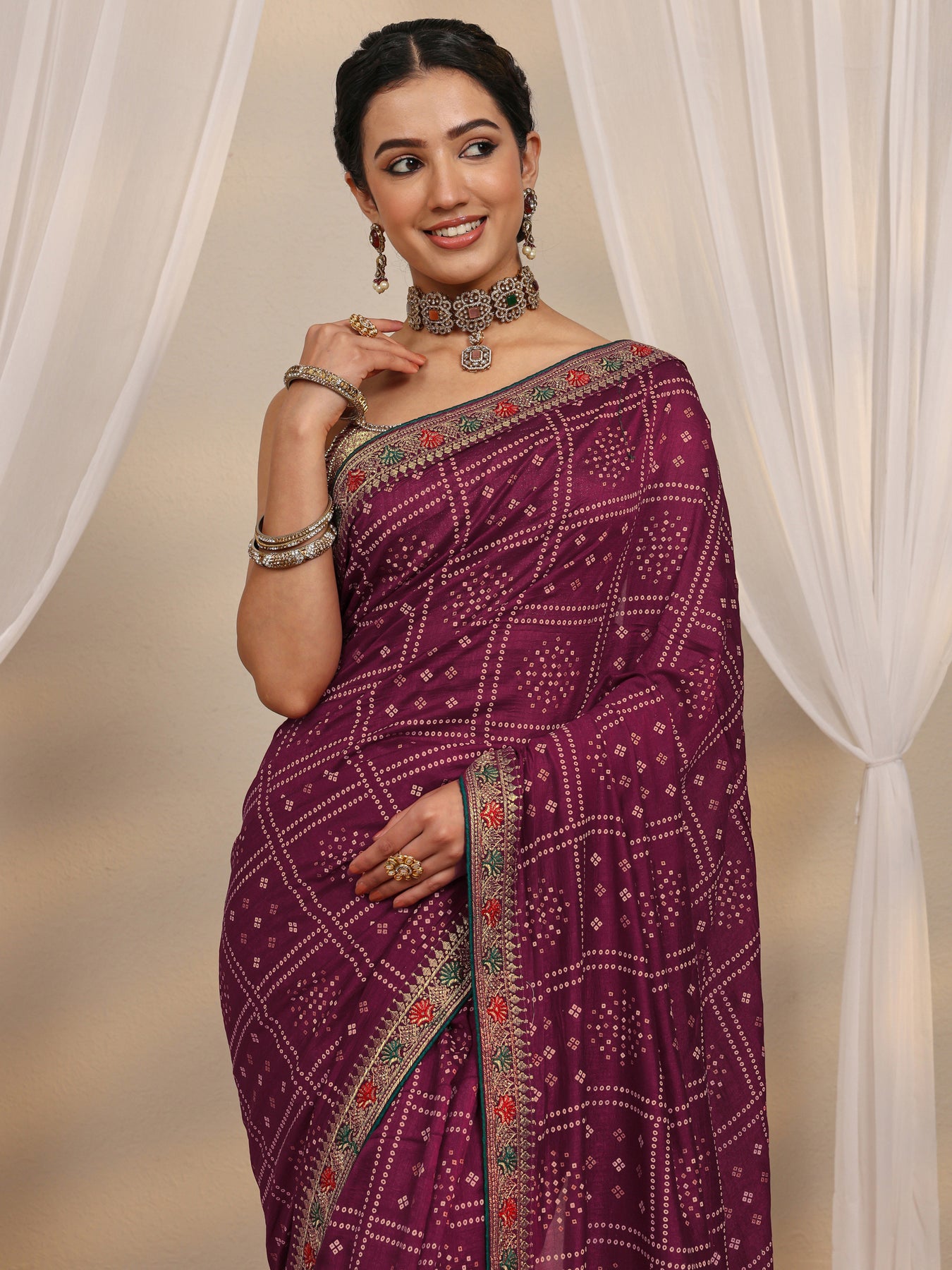 Maroon Bandhani Printed Silk Blend Saree With Unstitched Blouse Piece