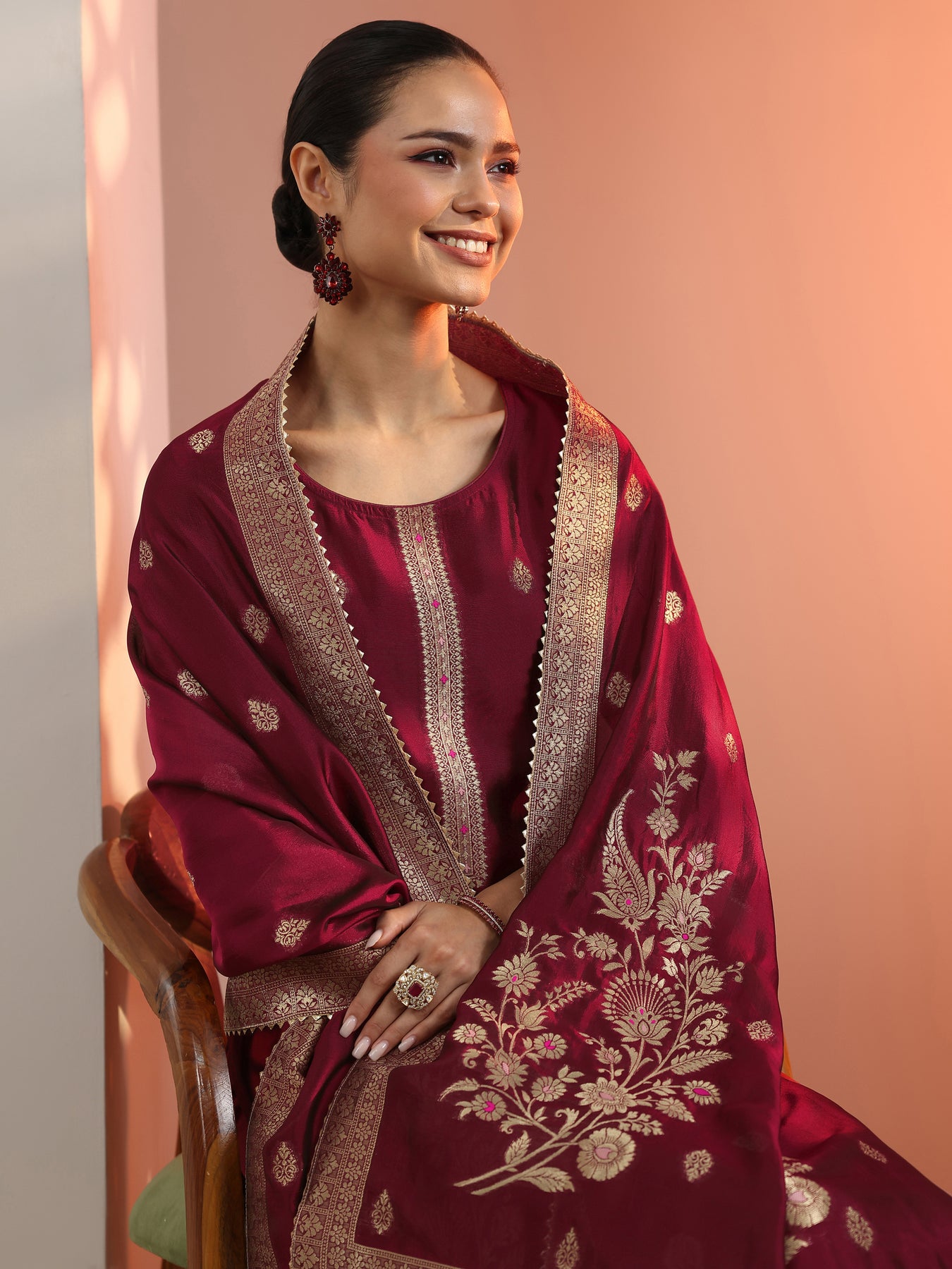 Maroon Woven Design Silk Blend Straight Suit Set With Dupatta