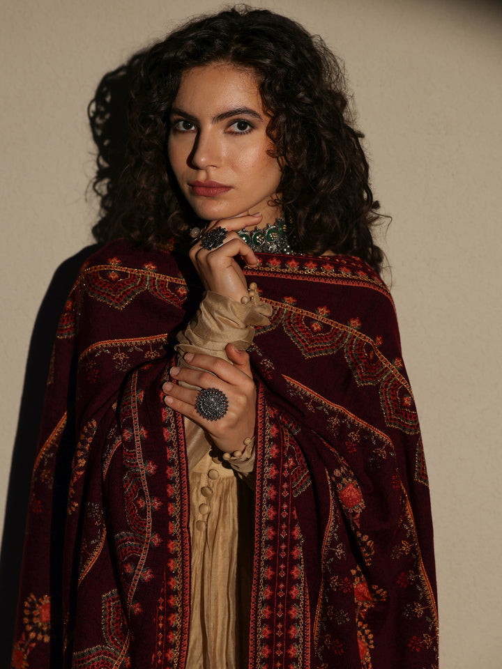Maroon woolen shawl featuring intricate heritage-craft inspired weaves in floral and chevron patterns. Designed to keep you warm and stylish, this versatile wrap pairs effortlessly with your occasion wear kurta set or drape it with your festive saree for winter wedding celebrations. Tailored with soft woven detailing for comfort and elegance, the shawl includes a hook closure on the front for convenient styling.