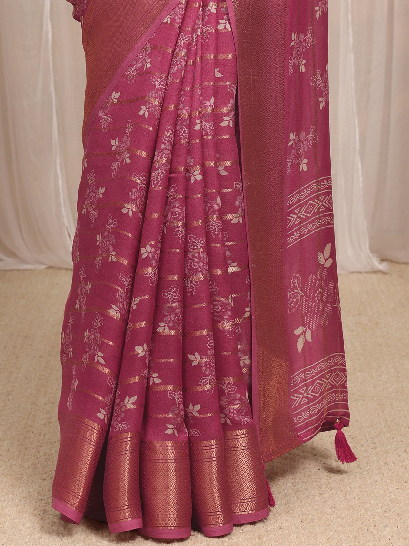 Mauve Floral Printed Silk Blend Saree With Unstitched Blouse Piece