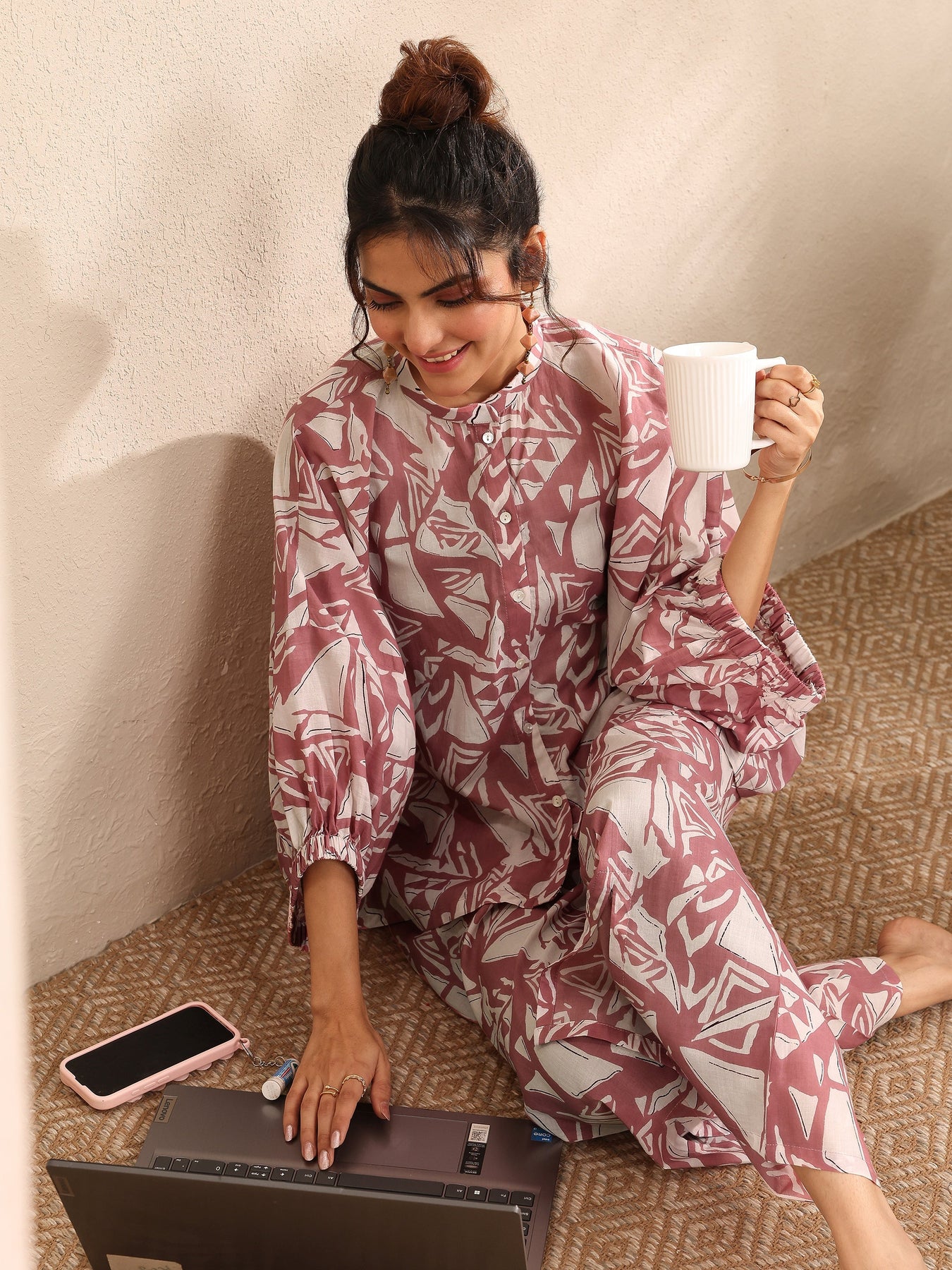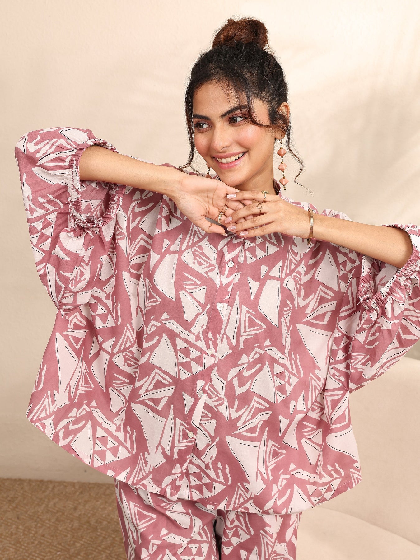 Our 2-piece Mauve printed Cotton nightsuit features a Straight-fit Top with a Round Neck neckline and Three-quarter sleeves. Complemented with matching Pyjamas with Partially Elasticated waistband and 2 pockets. Elevated with Top Print, this style is perfect for Night Wear.