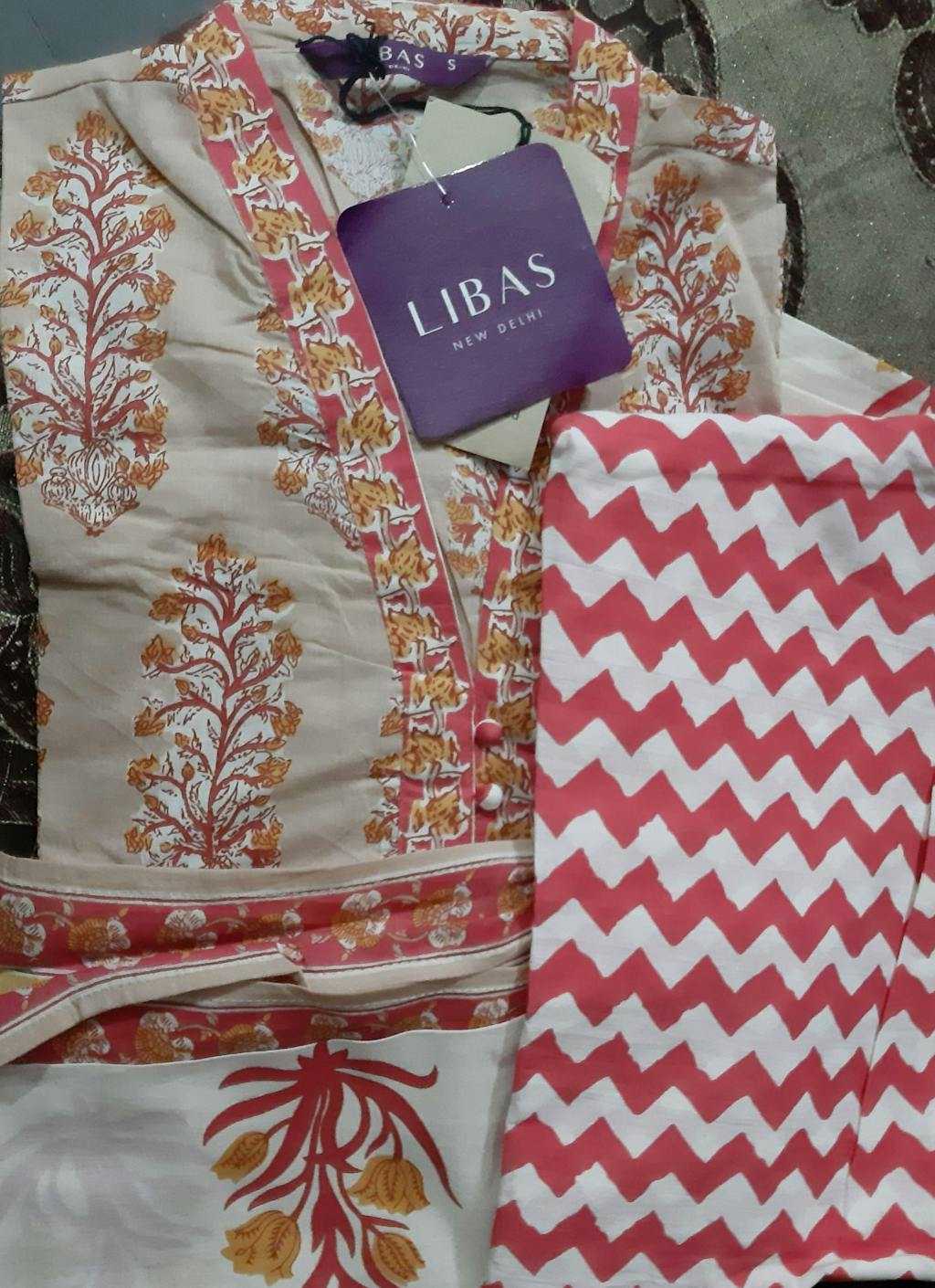 This 3-piece suit set includes our orange v- neck straight kurta, flared palazzo pants and dupatta in contrasting prints. Featuring trim details on the cuff and neckline. Perfect for outdoor lunches with friends and family.