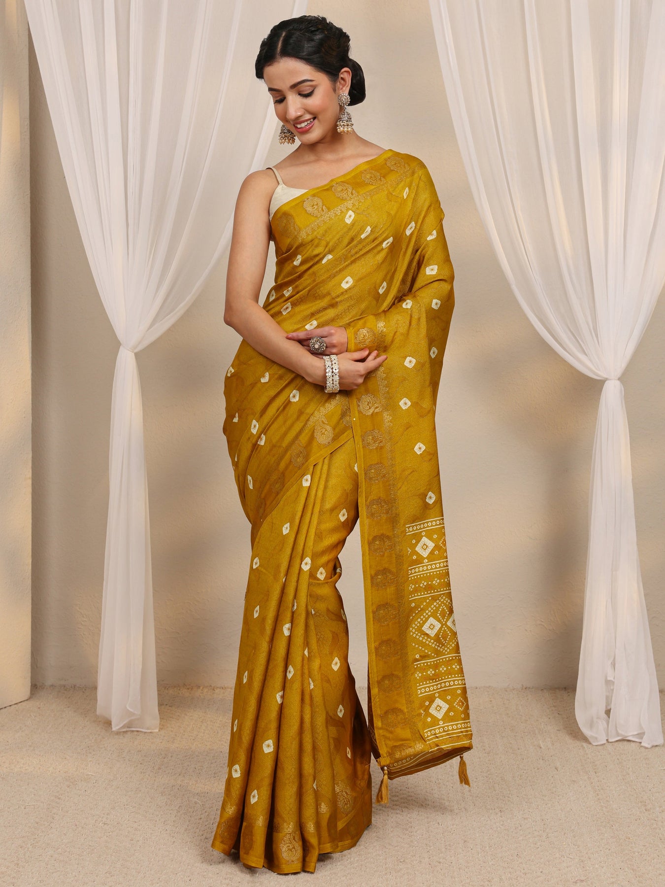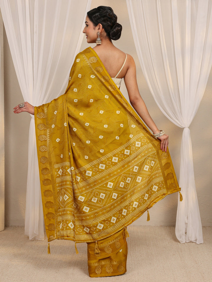 Mustard Bandhani Printed Silk Blend Saree With Unstitched Blouse Piece