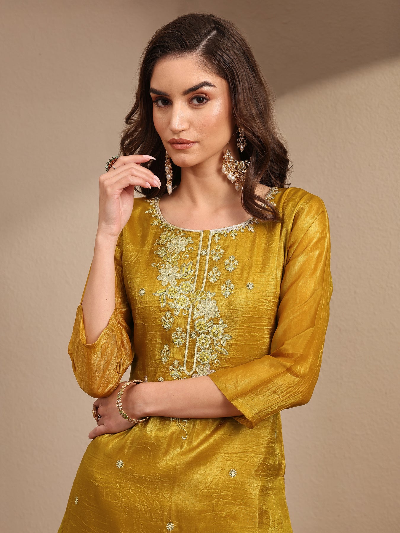 Our 3-piece mustard organza kurta set features a straight-fit kurta with a round neckline, regular sleeves, and statement yoke. Complemented with straight pants with a partially elasticated waistband and an embroidered dupatta. Adorned with floral embroidered, this style is perfect for festive occasions.