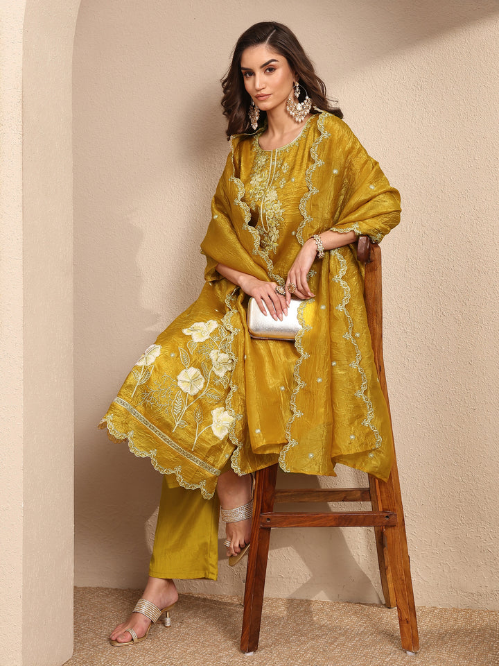 Mustard Embroidered Organza Straight Suit Set With Dupatta
