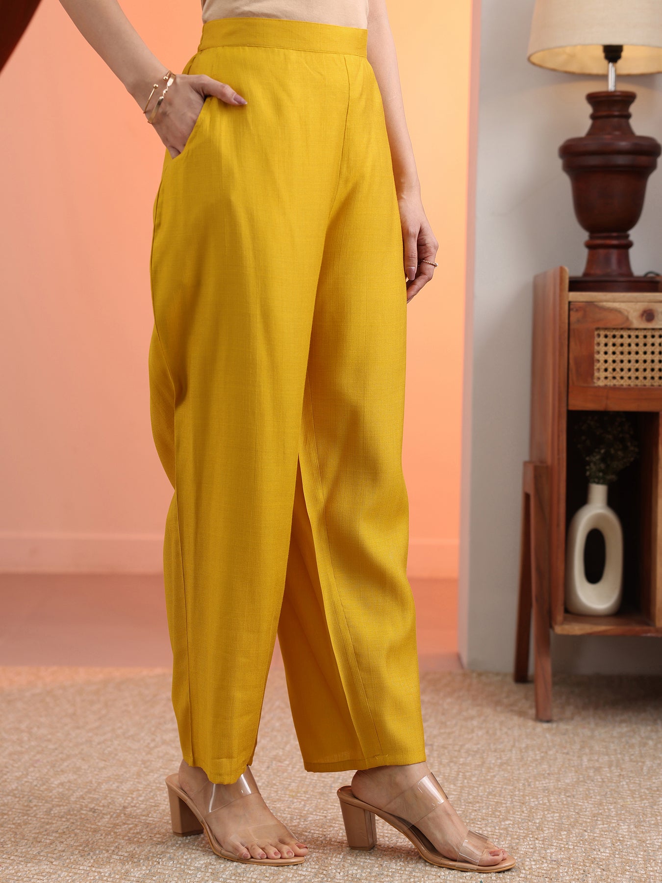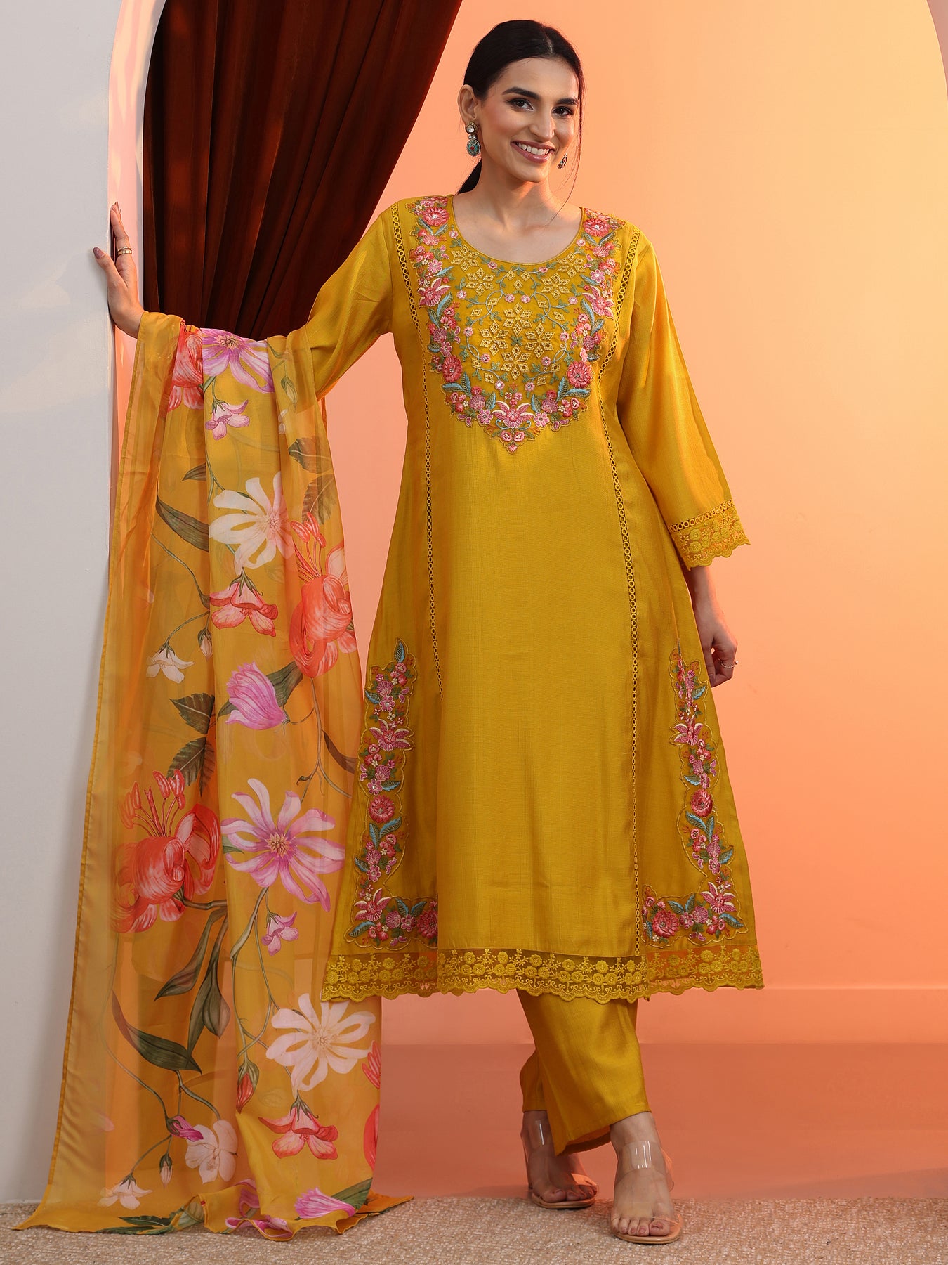 Mustard Embroidered Silk Blend Straight Suit Set With Dupatta