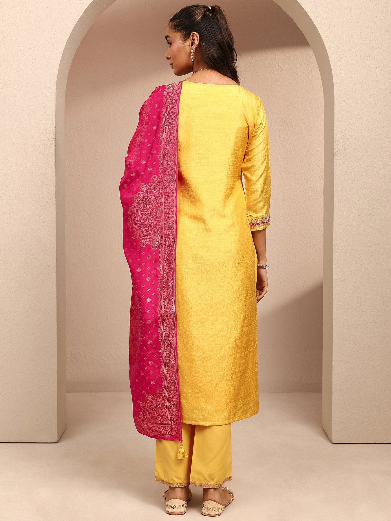 Our 3-piece yellow silk blend straight-fit kurta set features a sweetheart neckline, regular sleeves, and statement yoke. Complemented with straight pants with a partially elasticated waistband and 2 pockets, and an woven design dupatta. Adorned with floral zari embroidered, this style is perfect for festive occasions.