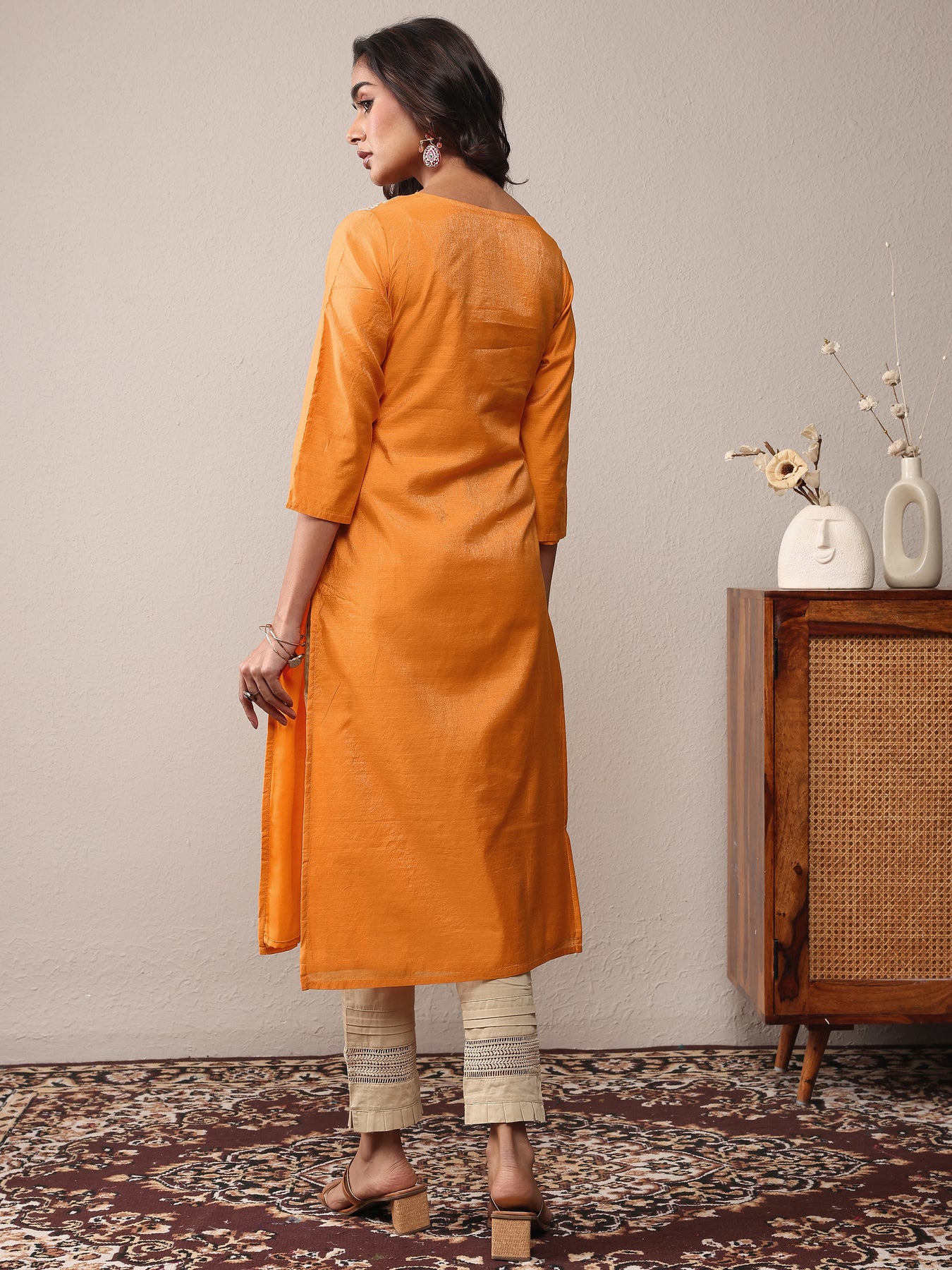 Our 1-piece orange Chanderi silk straight-fit kurta features a square neckline, regular sleeves, and statement Yoke. Adorned with ethnic motif embroidered, this style is perfect for festive occasions.