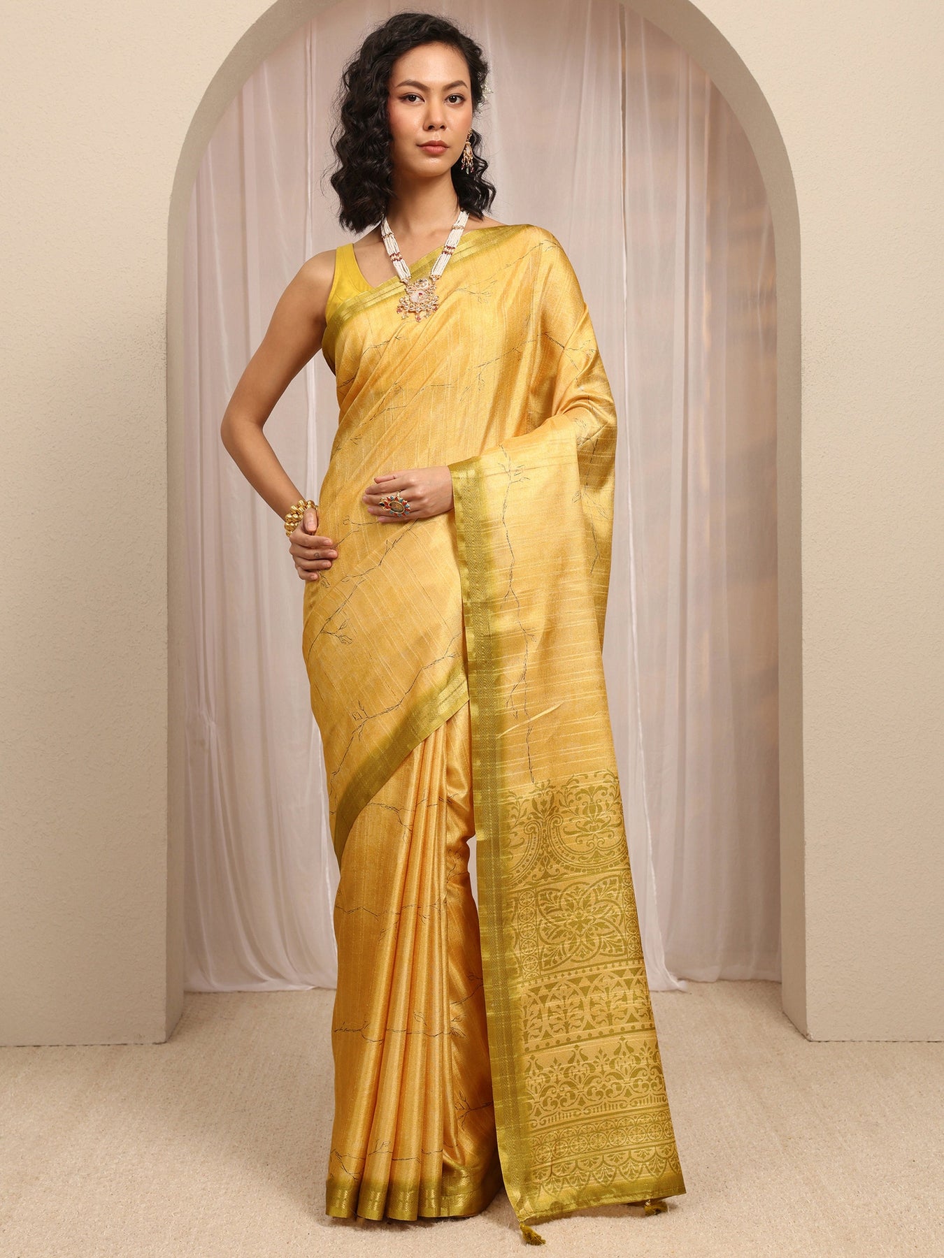Mustard Floral Printed Silk Blend Saree With Unstitched Blouse Piece