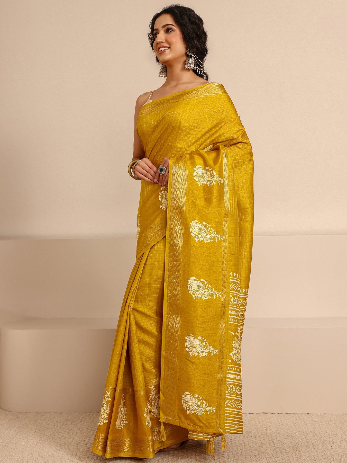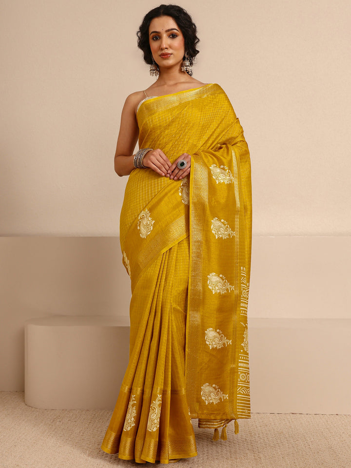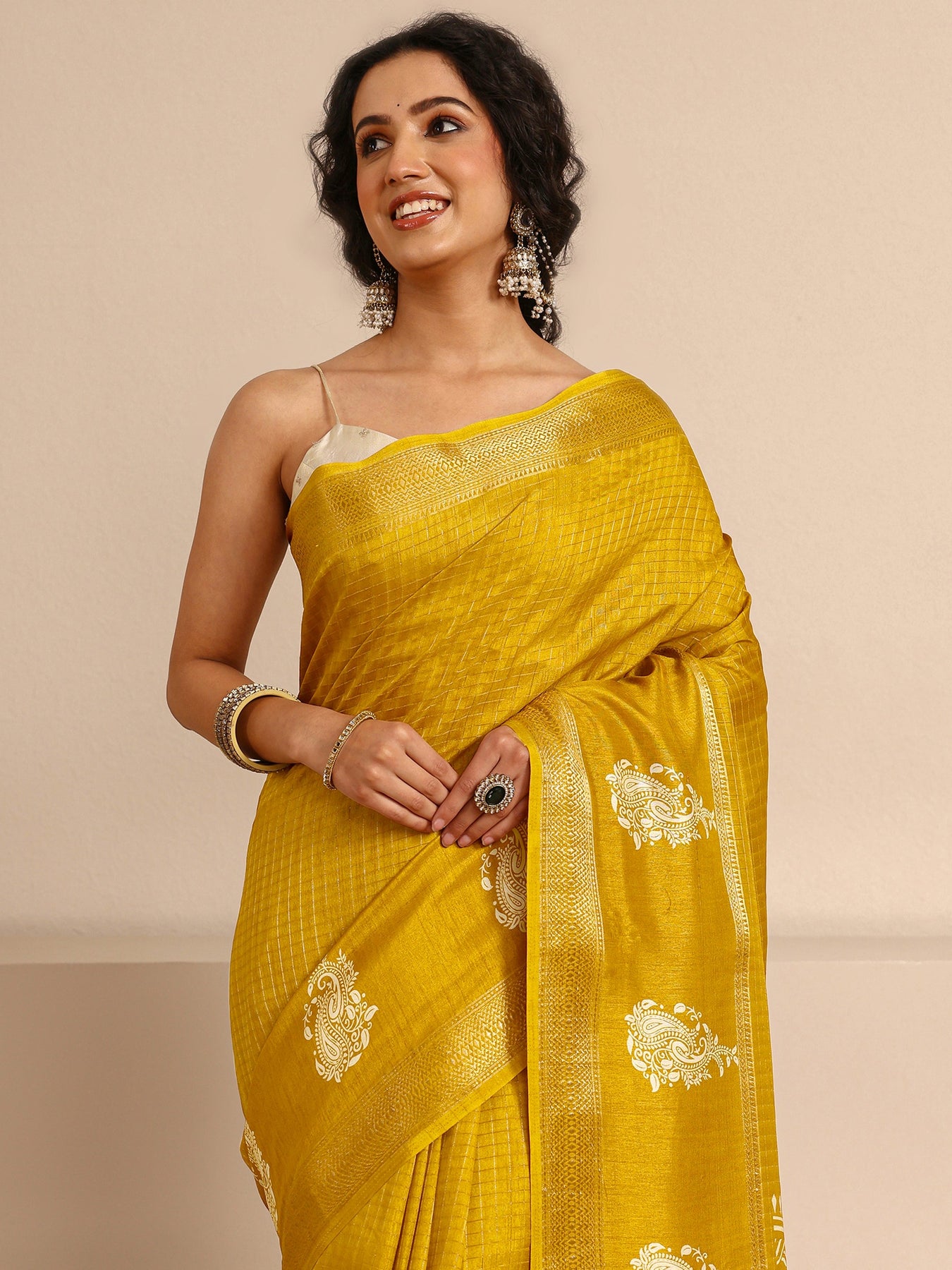 Mustard Paisley Print Silk Blend Saree With Unstitched Blouse Piece