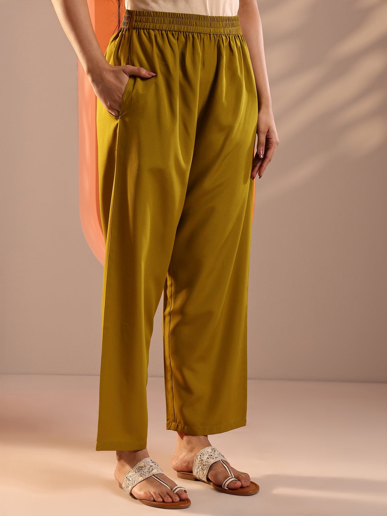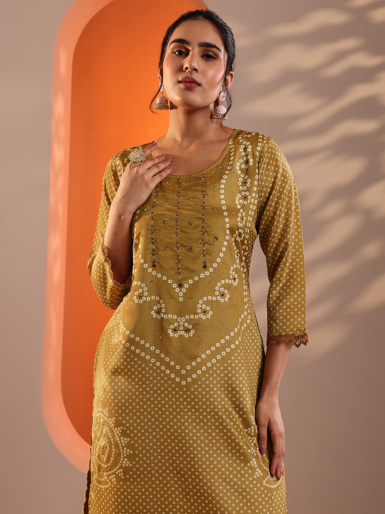 Our 3-piece Olive and Pink Chinon Straight-Fit Kurta Set features a Round Neckline, Regular Sleeves, and statement Yoke. Complemented with Lining and Straight Pants with a Partially Elasticated waistband and 2 pockets, and a Bandhani inspired print dupatta. Adorned with Bandhani inspired print, this style is perfect for Festive occasions.
