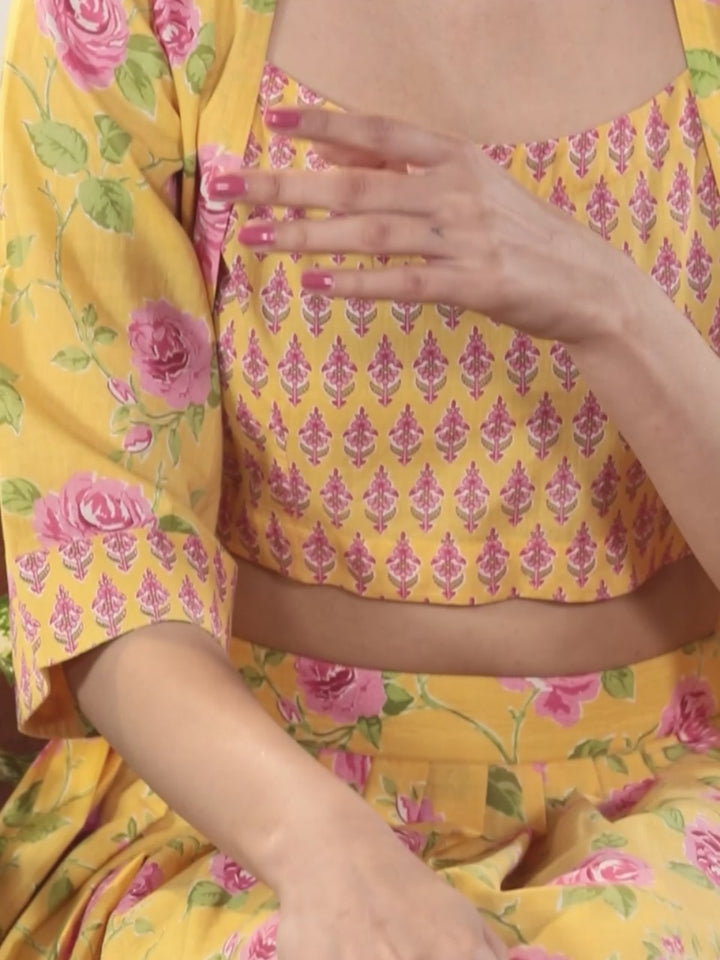 Our 3-piece mustard yellow floral print cotton co-ord set features a sleeveless crop top with a strappy neckline and a functional side-zip closure, a pleated skirt with a partially elasticated waistband and a flared hemline, and a matching print jacket with three-quarter flared sleeves and stylish side-slit detailing. Adorned with delicate fabric-trim accents, this graceful style is perfect for light festivities.