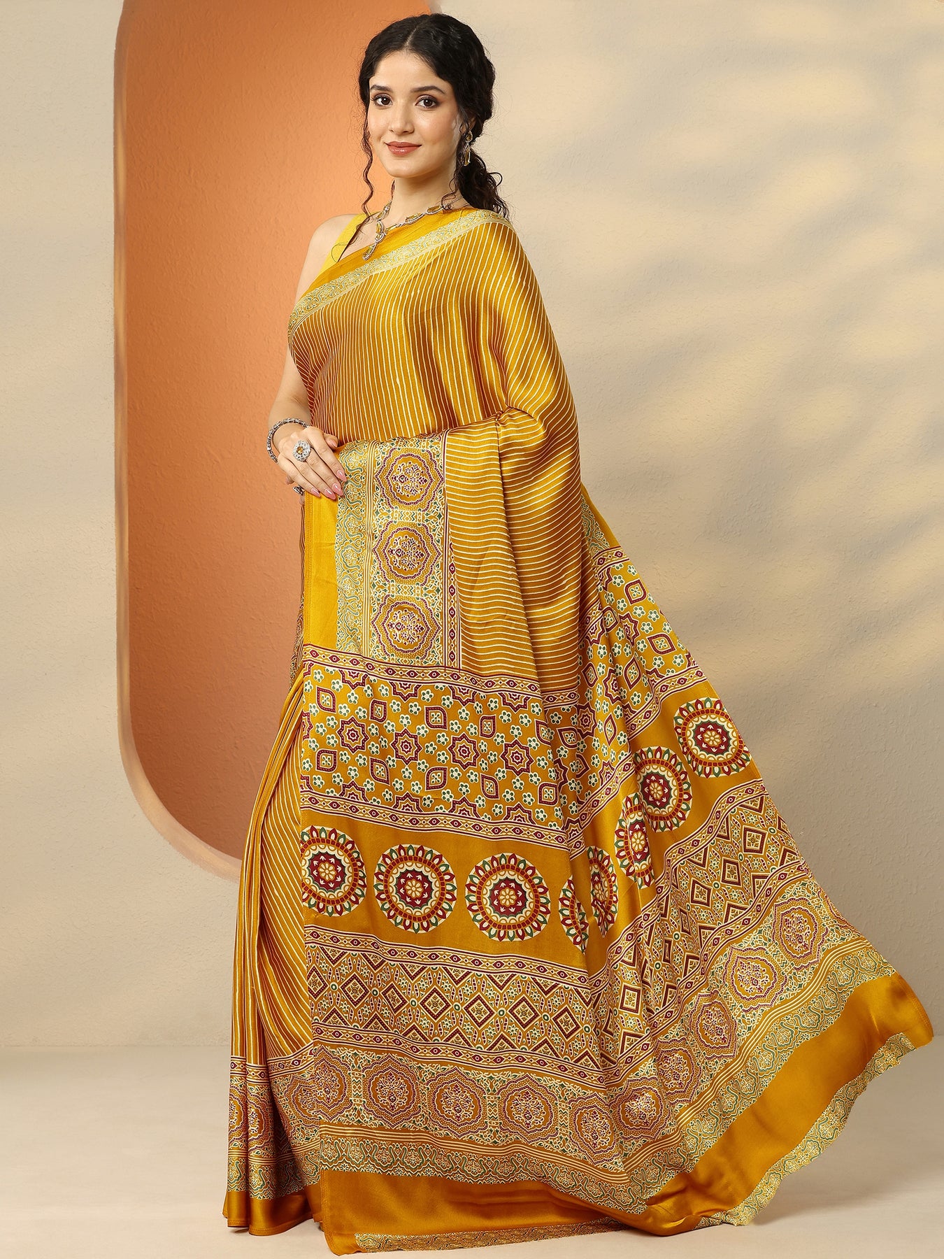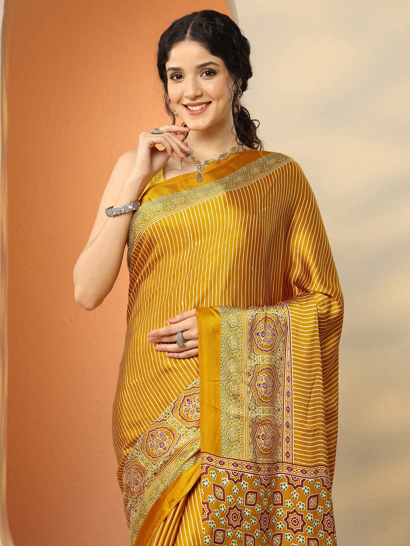Mustard Printed Satin Saree With Unstitched Blouse Piece