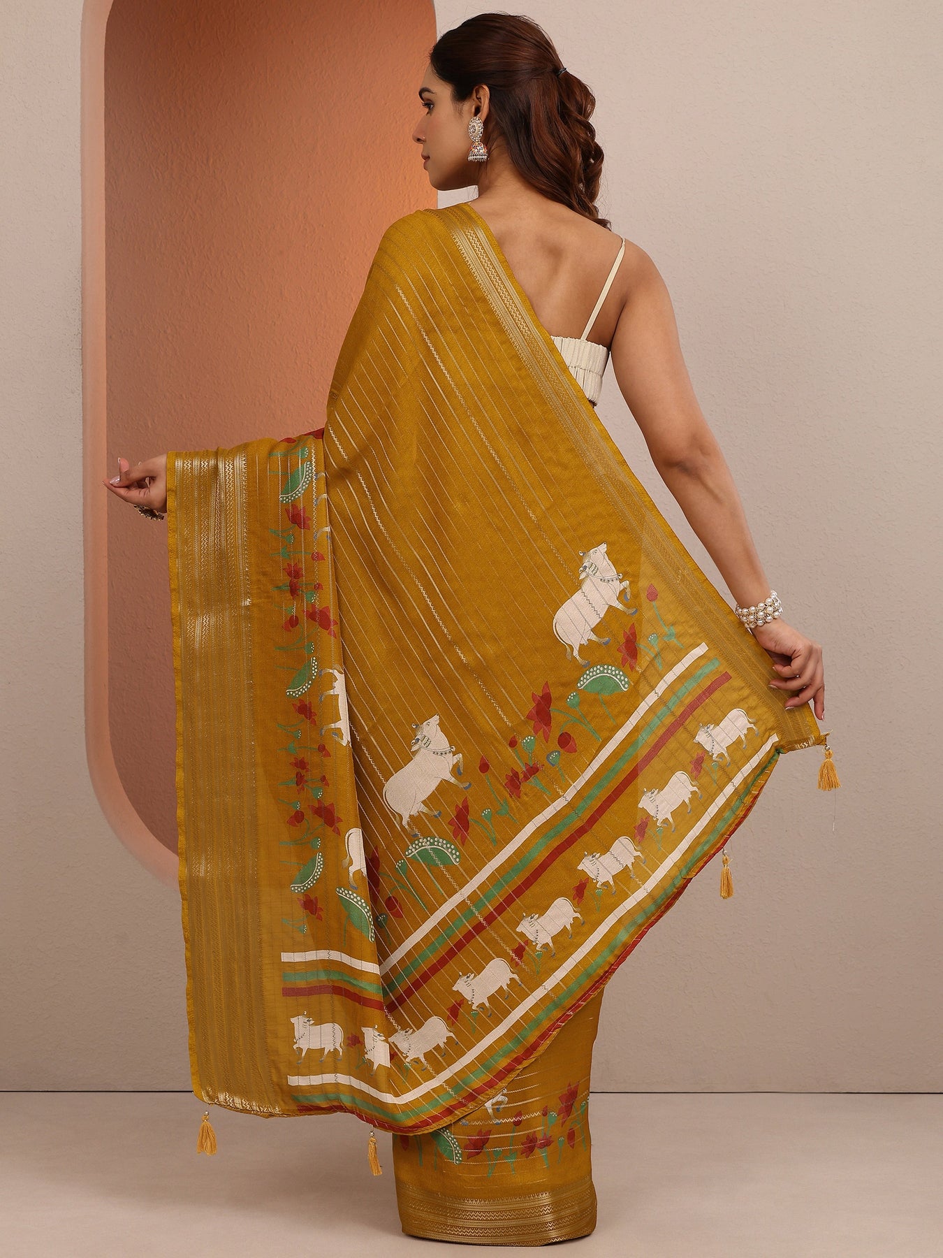 Mustard Printed Silk Blend Saree With Unstitched Blouse Piece
