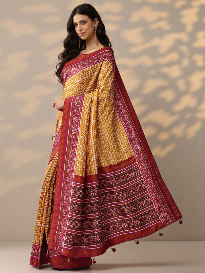 Mustard Printed Silk Blend Saree With Unstitched Blouse Piece