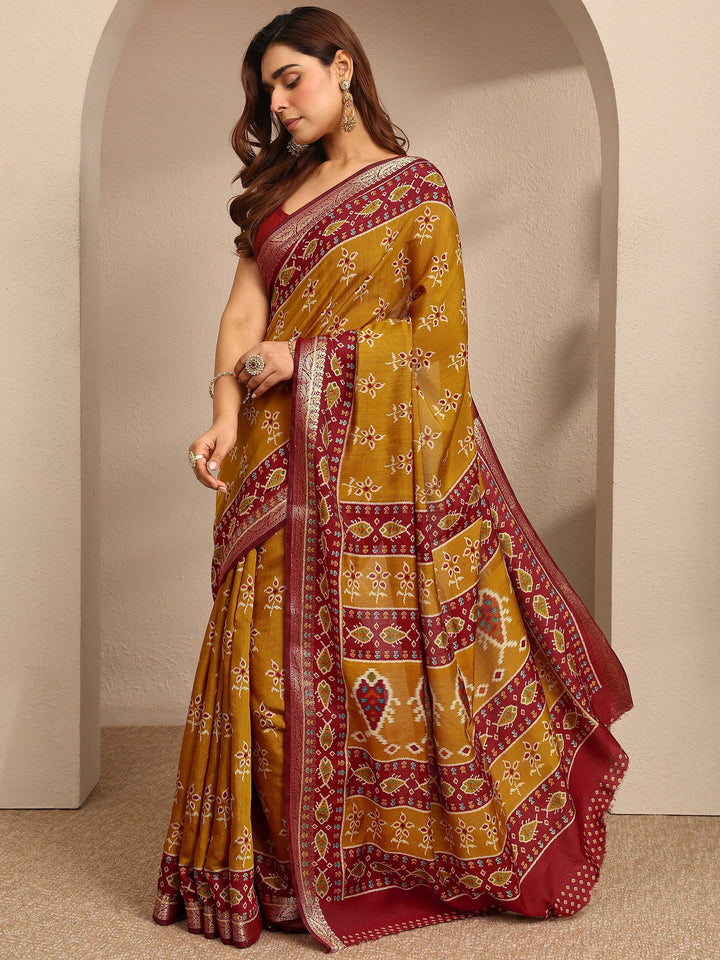 Mustard Printed Silk Blend Saree With Unstitched Blouse Piece