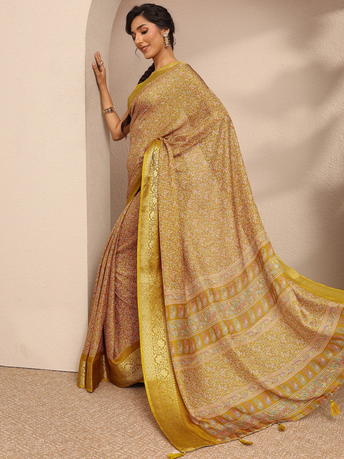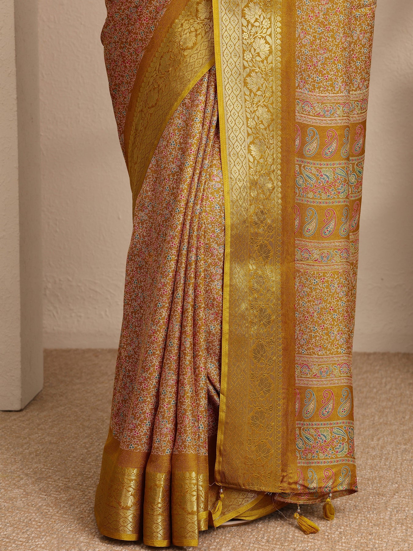 Mustard Printed Silk Blend Saree With Unstitched Blouse Piece