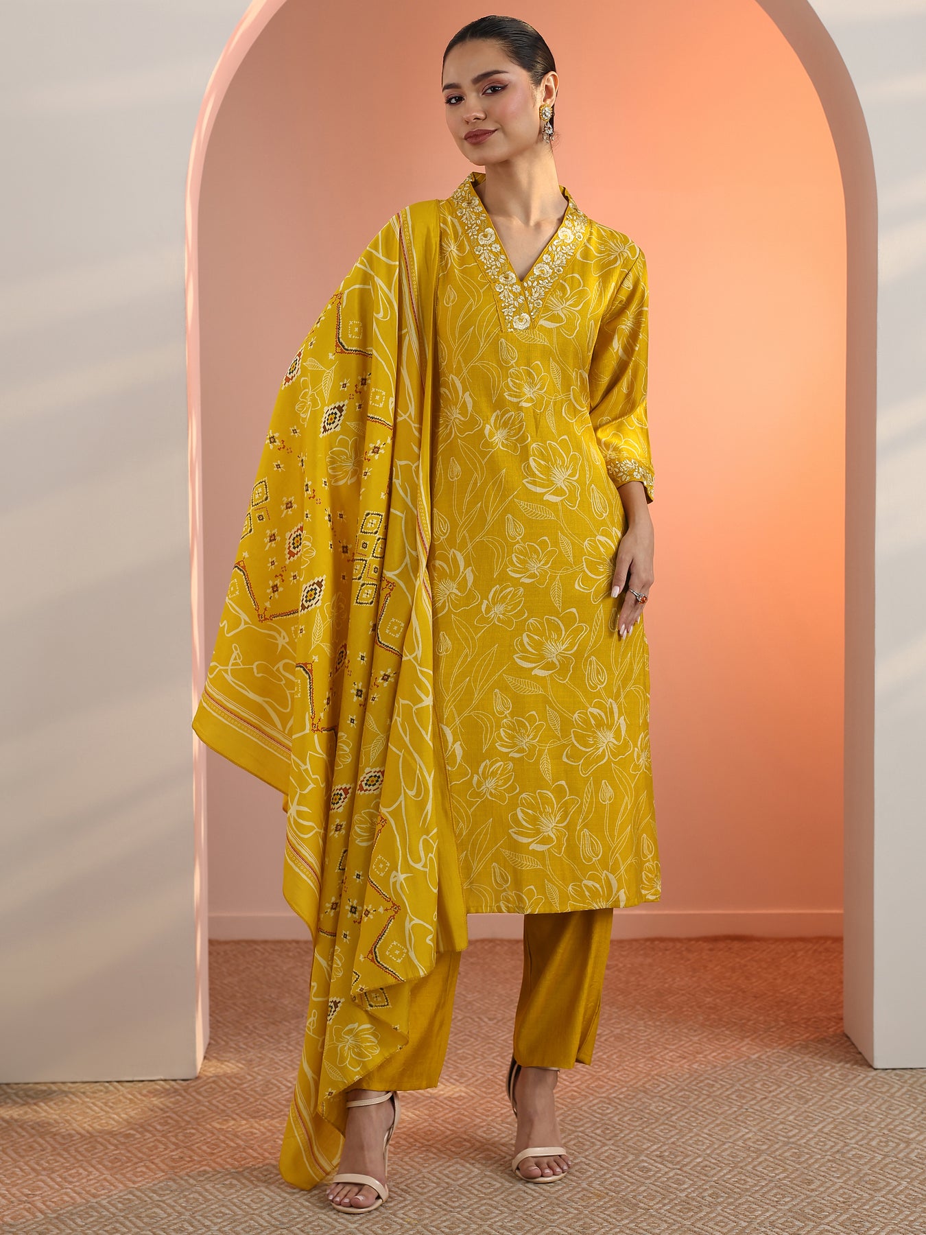 Mustard Printed Silk Blend Straight Suit Set With Dupatta