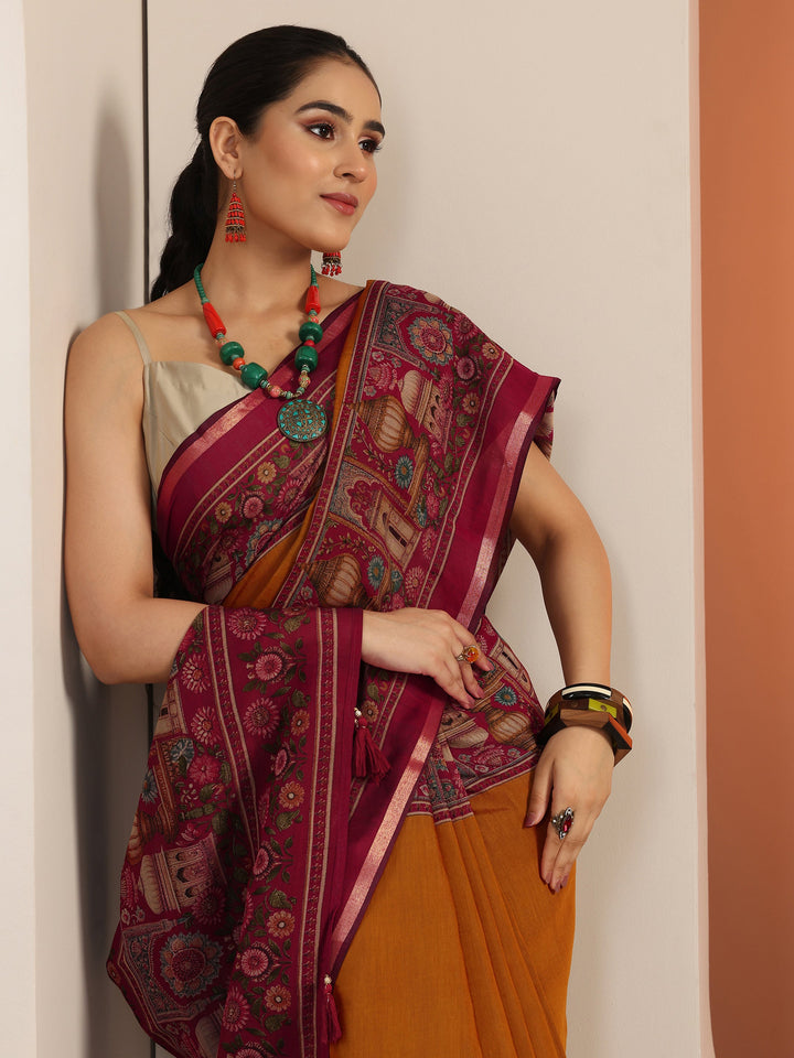Our Brown Printed Cotton Blend Saree Features Captivating Solid Print. Complemented With A Unstitched Blouse Piece. This Charming Saree Is Perfect For Festive Wear.