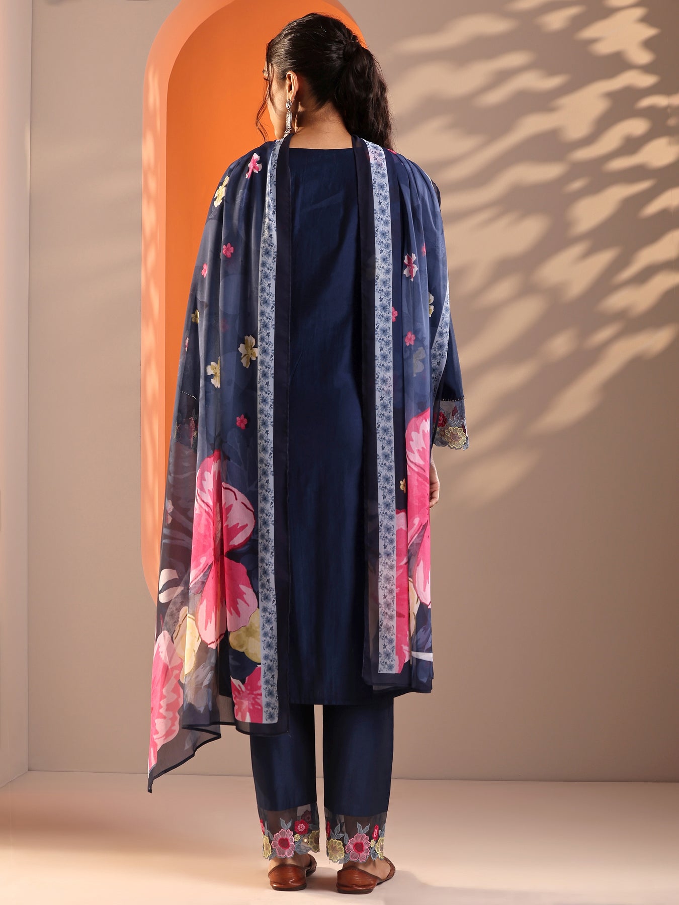 Navy Blue Embroidered Silk Blend Straight Suit Set With Dupatta