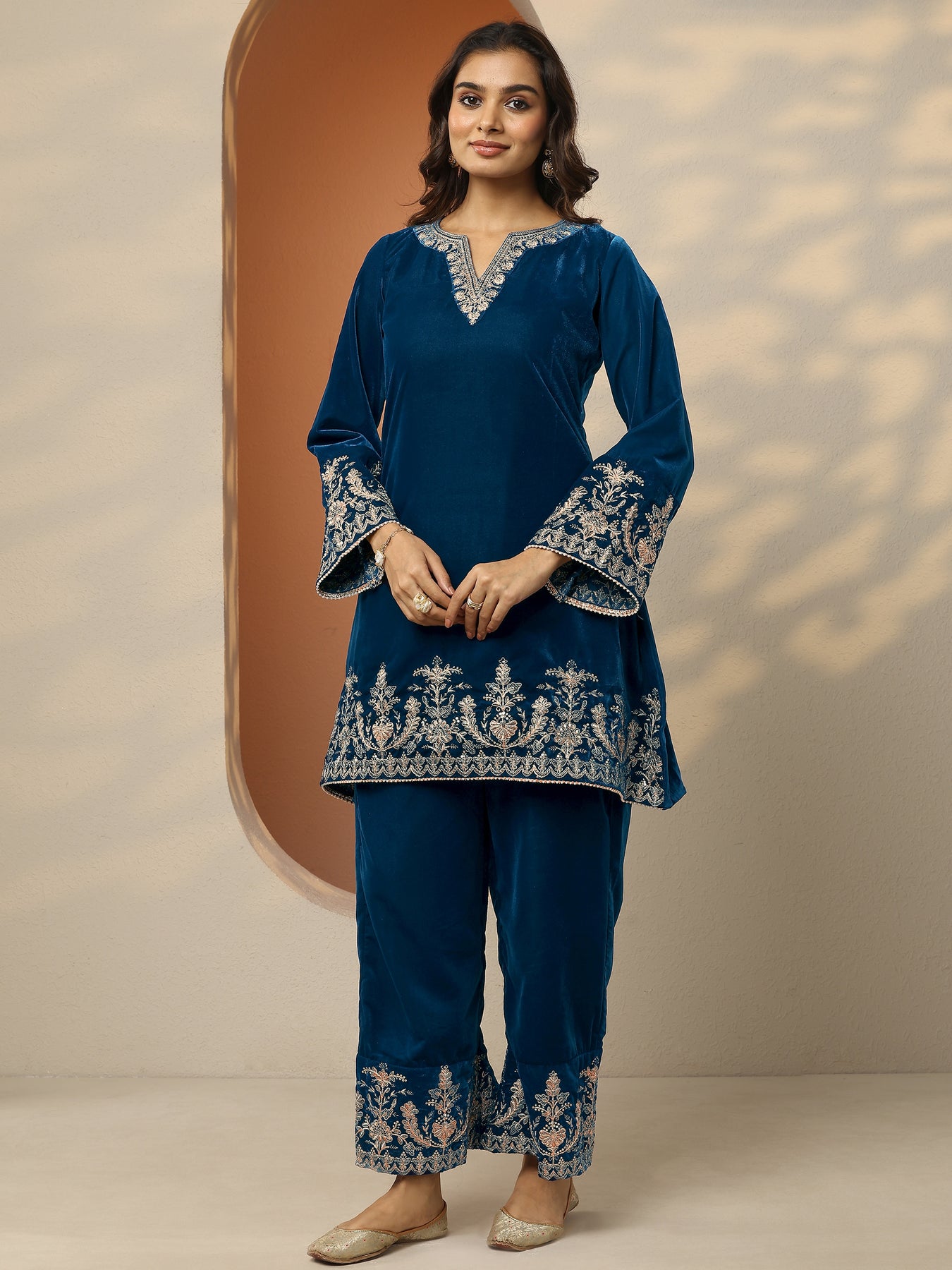 Navy Blue Embroidered Velvet Co-Ord Sets