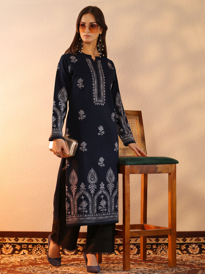 Our 1-piece navy blue wool straight-fit kurta features a mandarin collar neckline, regular sleeves, and statement Yoke. Adorned with floral embroidered, this style is perfect for dark festive occasions.