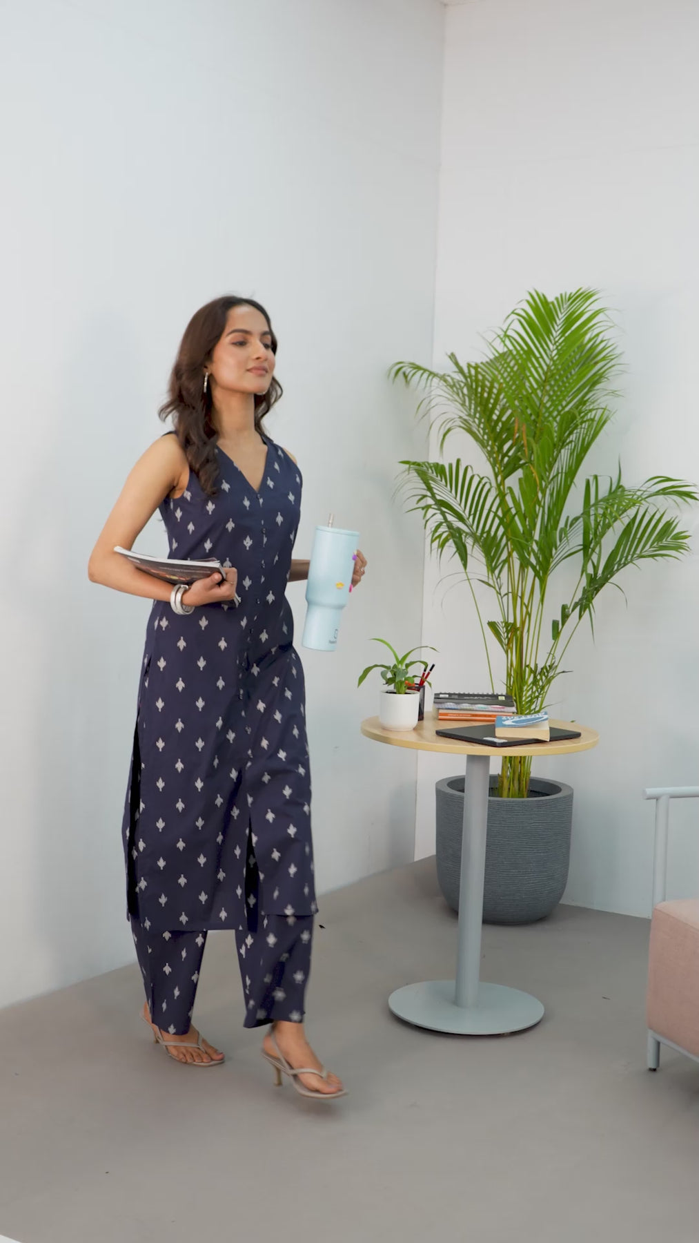 Navy Blue Floral Printed Cotton Blend Straight Kurta Set