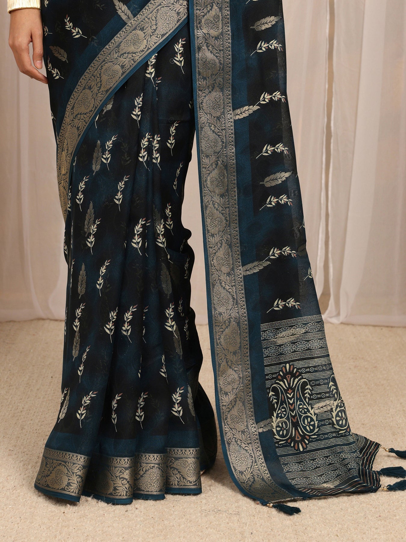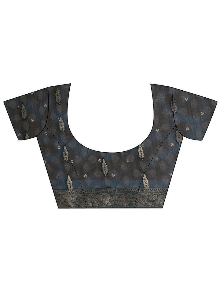 Navy Blue Floral Printed Silk Blend Saree With Unstitched Blouse Piece