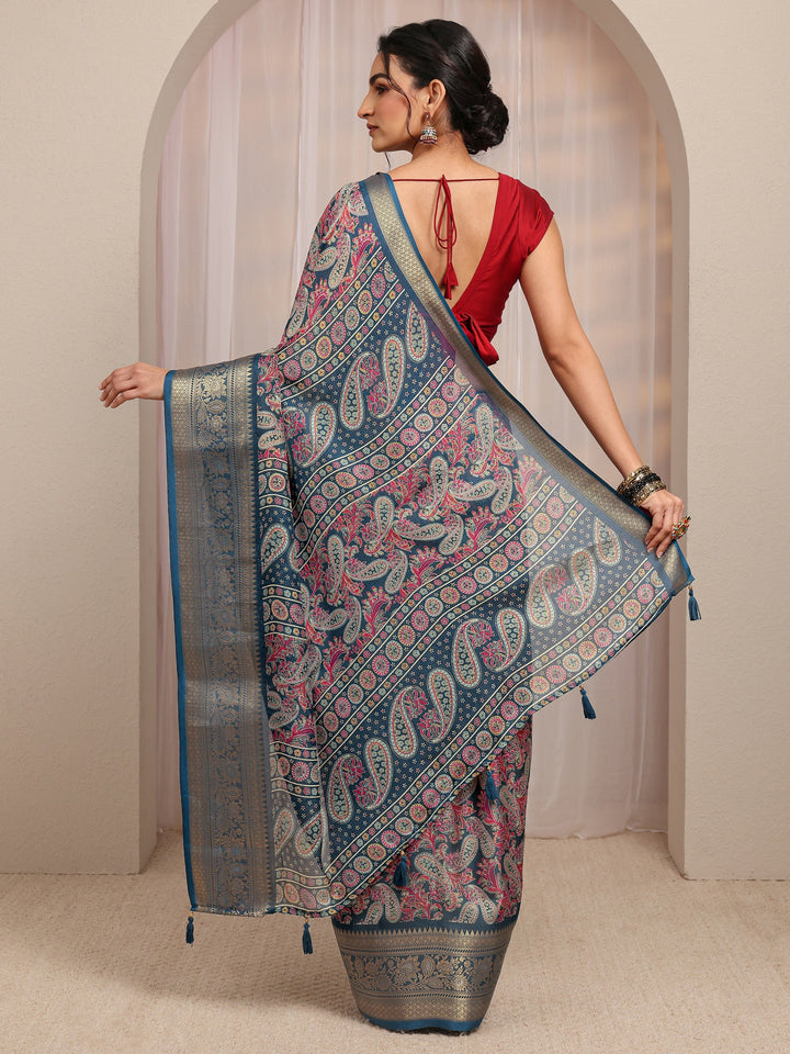 Navy Blue Paisley Printed Silk Blend Saree With Unstitched Blouse Piece