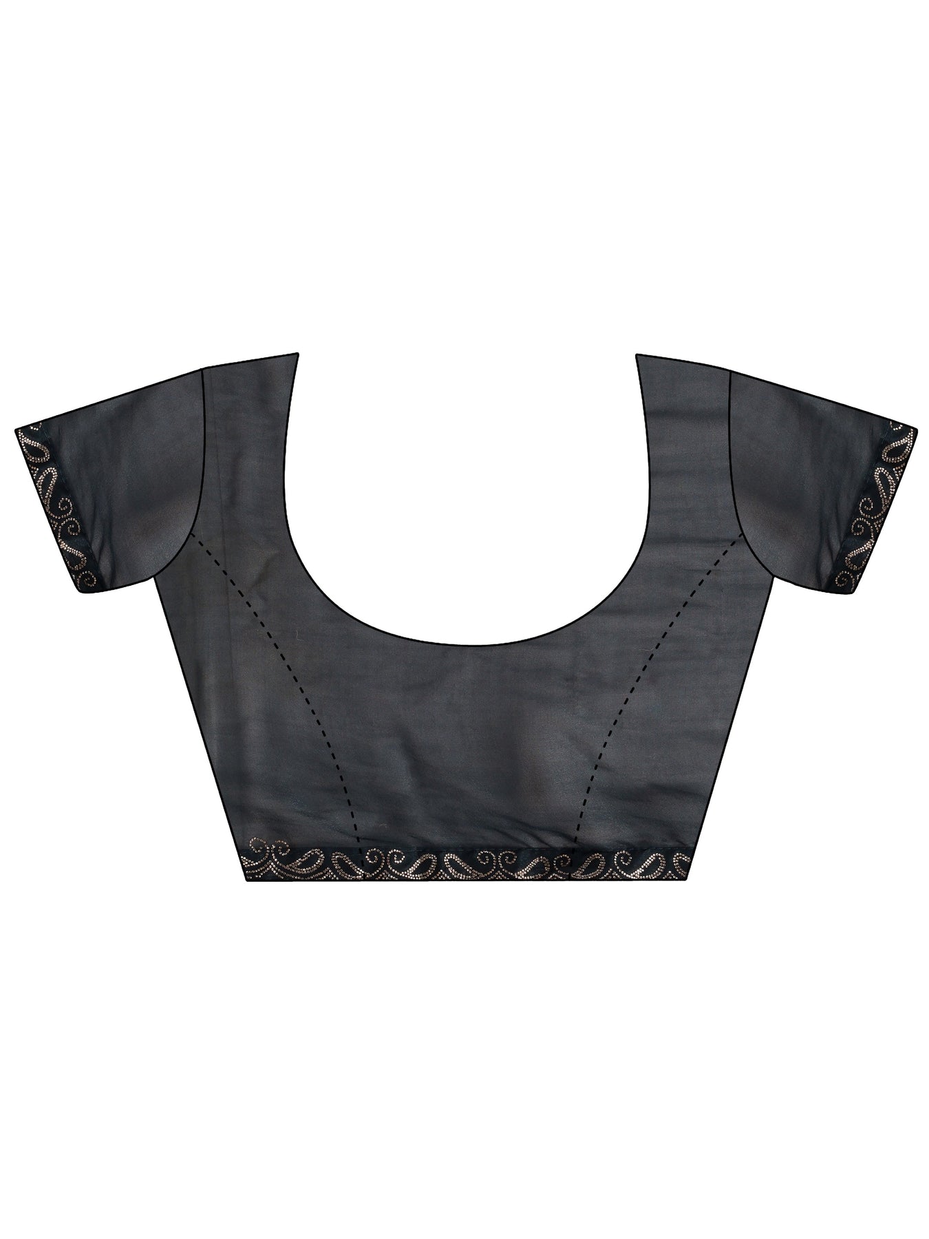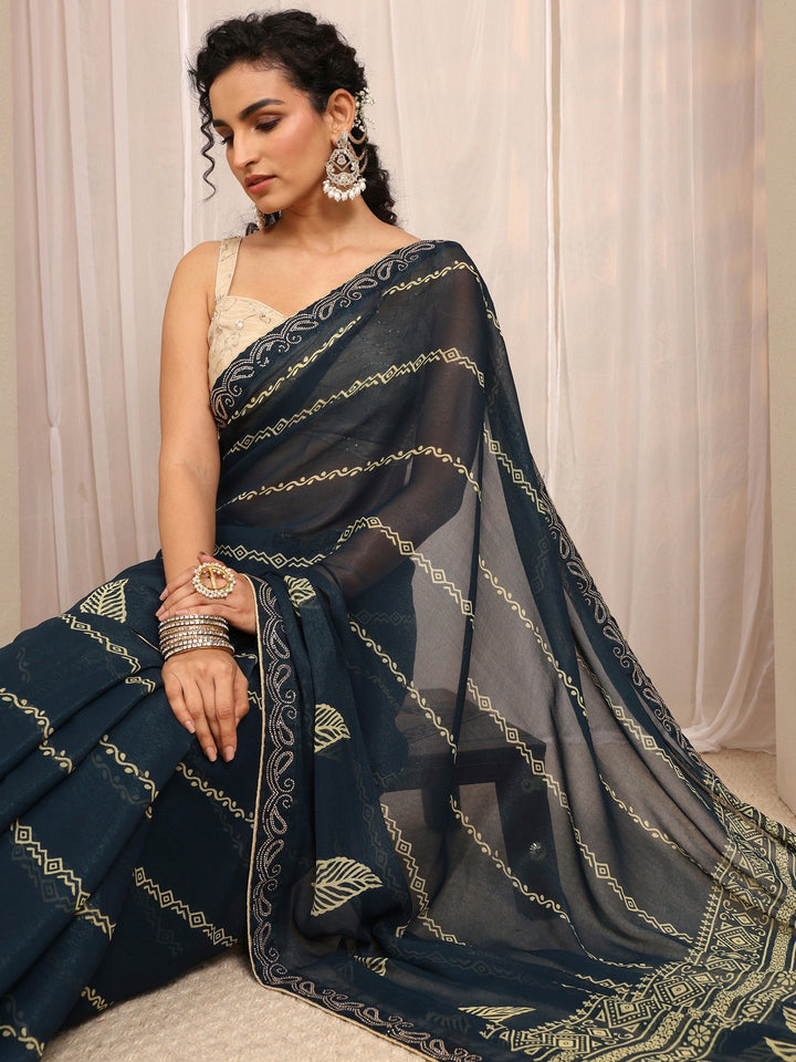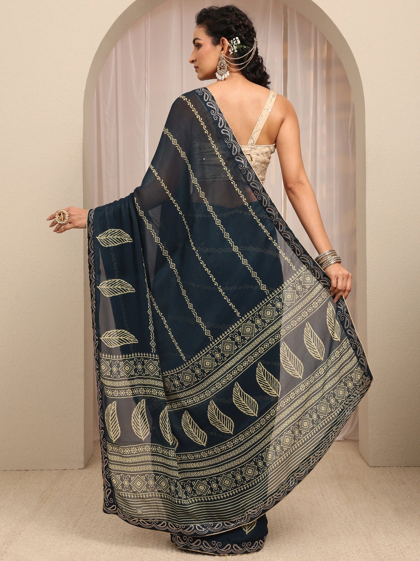 Navy Blue Printed Silk Blend Saree With Unstitched Blouse Piece