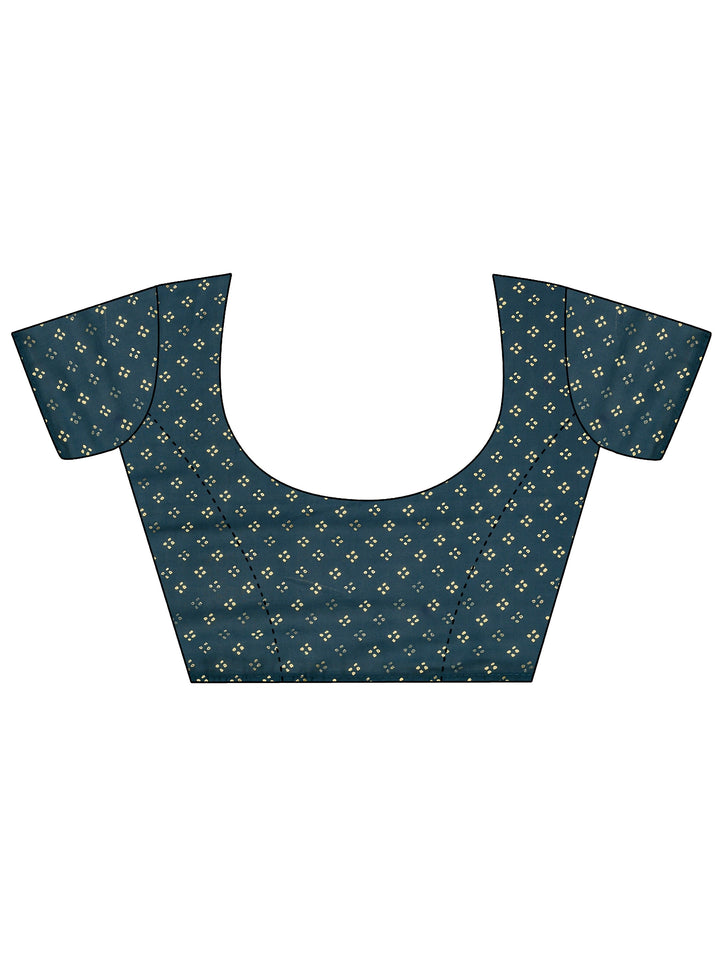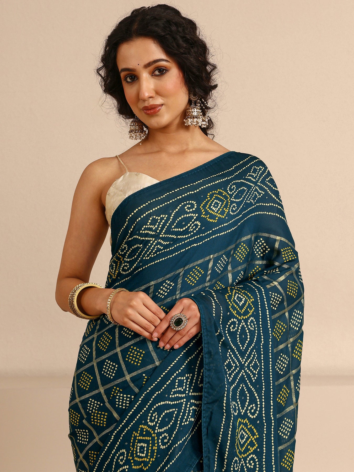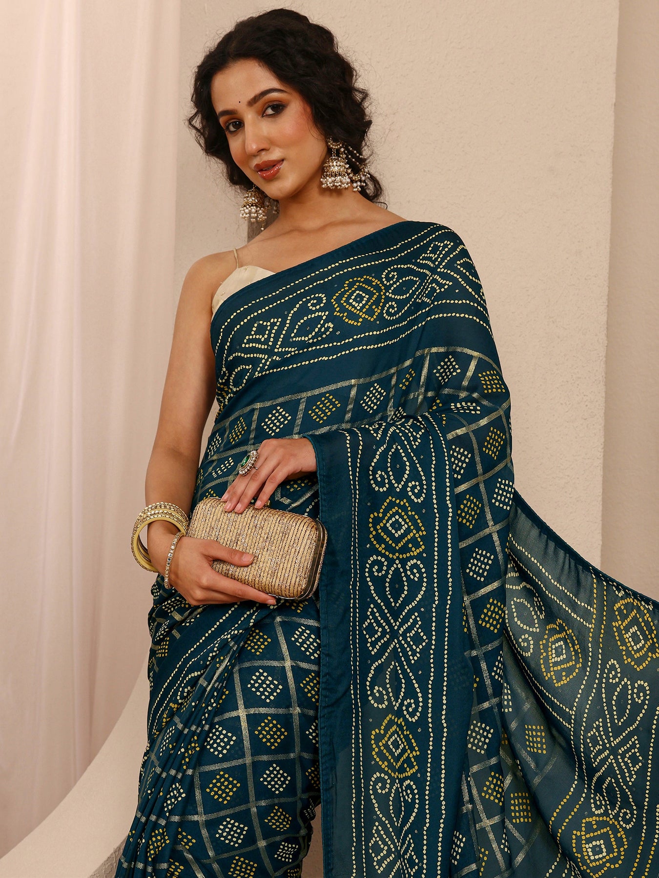 Our vibrant navy blue silk-blend saree features a traditional Bandhani-inspired print with intricate geometric patterns and gold-toned accents. Complemented with unstitched blouse, this graceful saree is perfect for festive occasions and traditional celebrations.
