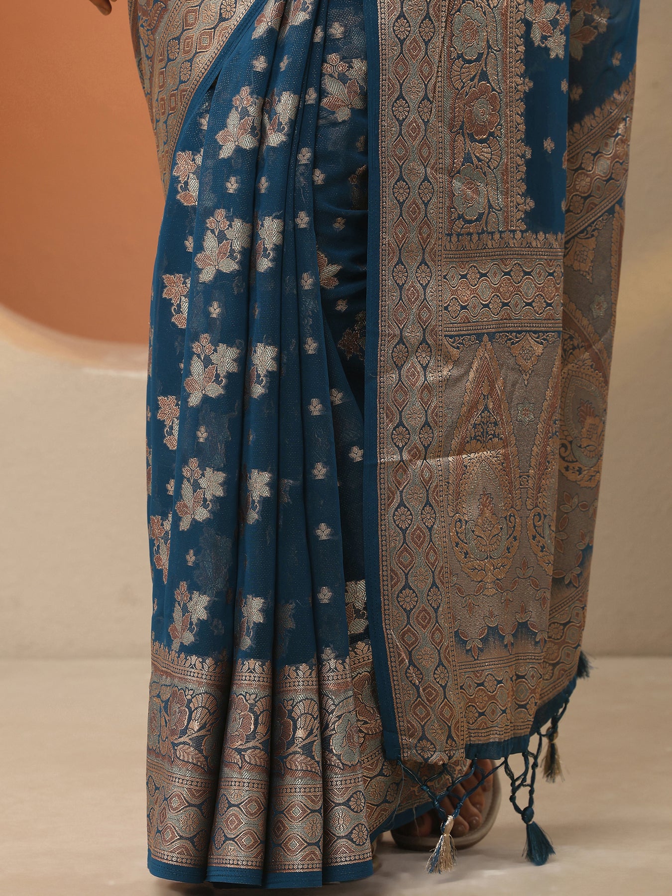 Navy Blue Woven Design Pure Georgette Saree With Unstitched Blouse Piece