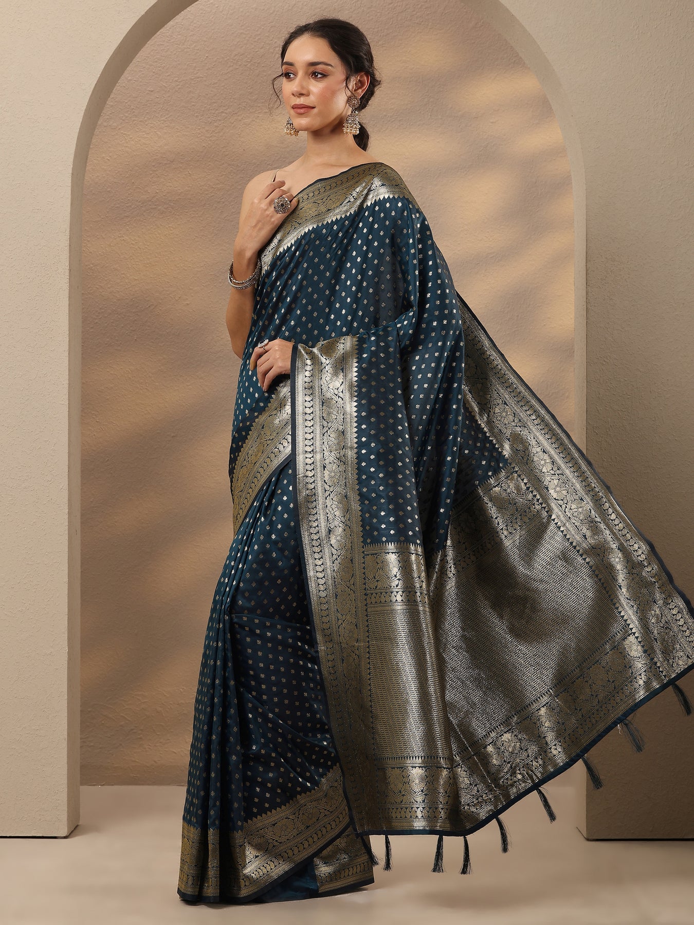 Navy Blue Woven Design Silk Blend Saree With Unstitched Blouse Piece