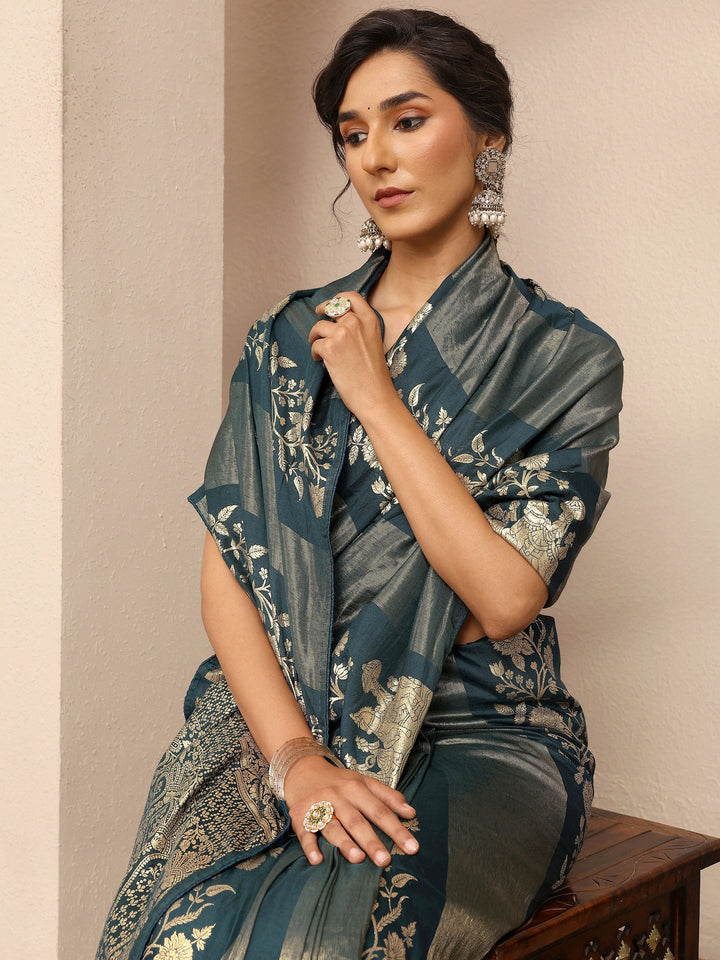 Navy Blue Woven Design Silk Blend Saree With Unstitched Blouse Piece