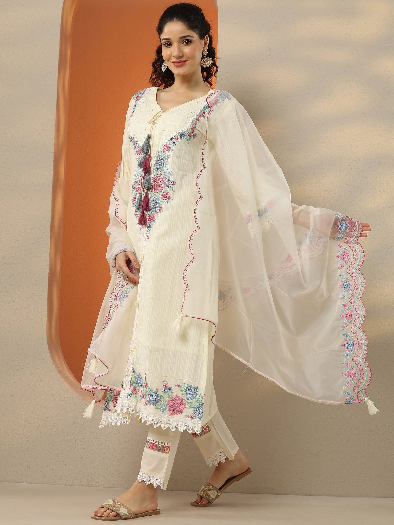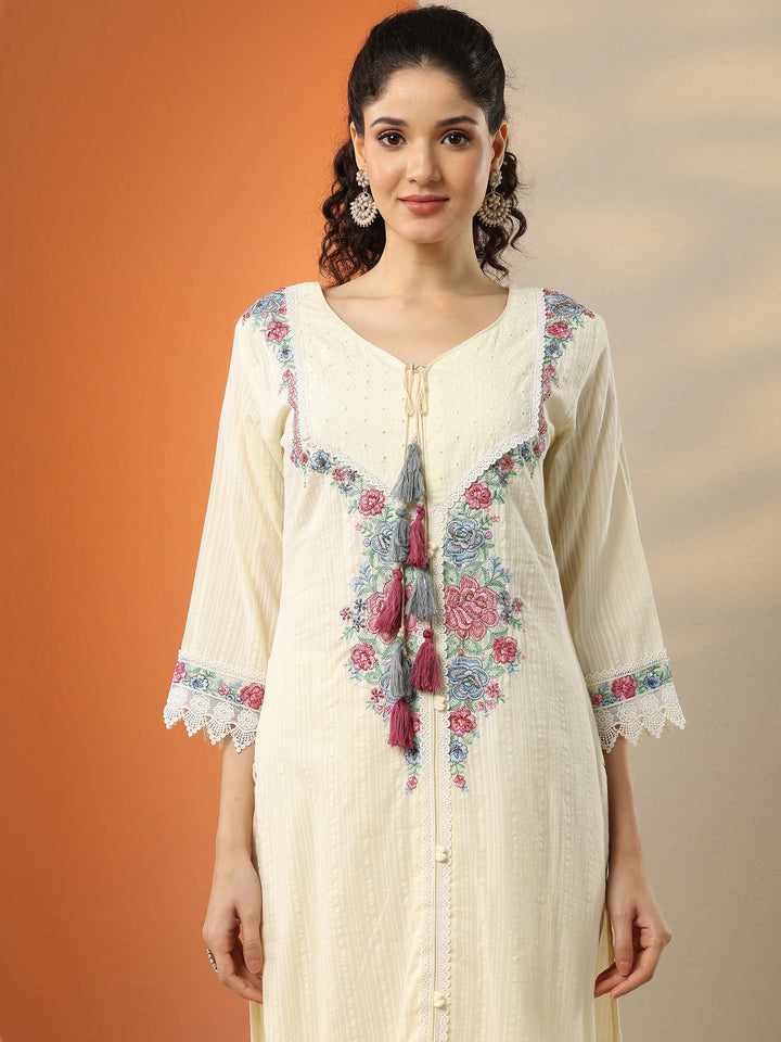 Off White Embroidered Cotton Straight Suit Set With Dupatta