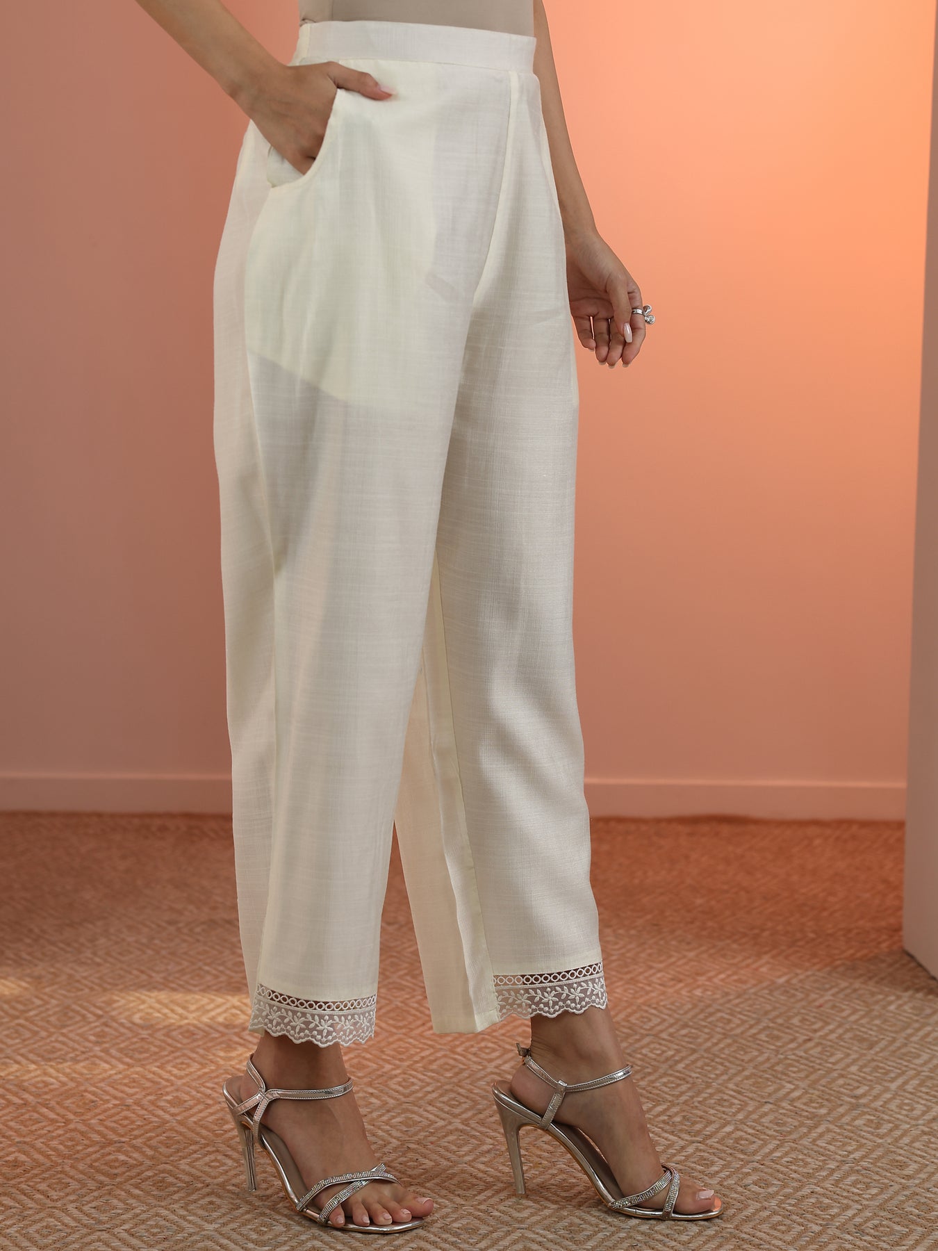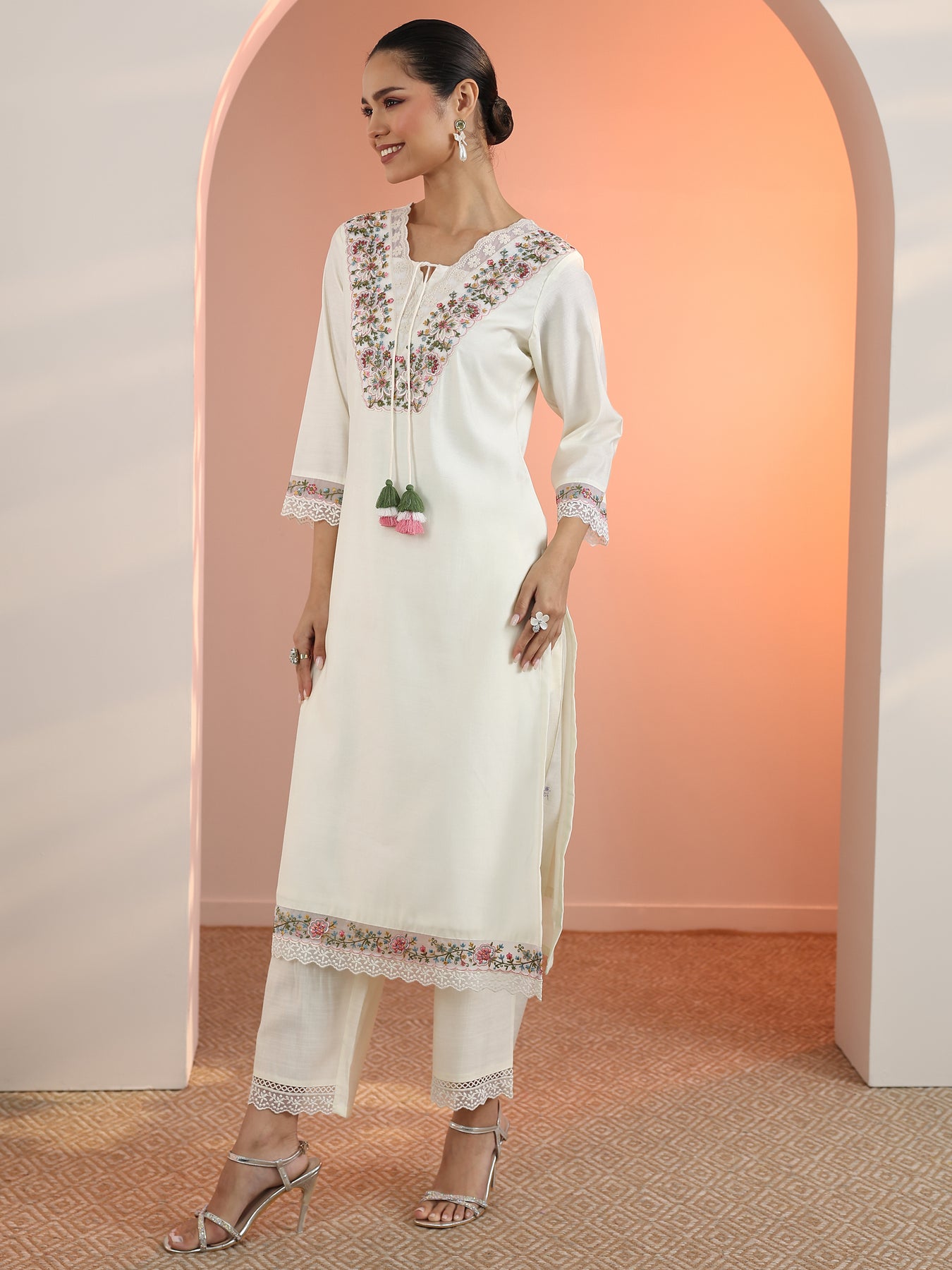 Our 3-piece Off White Silk blend Kurta Set features a Straight-fit kurta with a V-Neckline, Regular Sleeves, and statement yoke. Complemented with Straight Pants with a Partially Elasticated waistband and 2 pockets, and a Printed dupatta. Adorned with Floral Embroidered accents, this style is perfect for Semi festive wear.