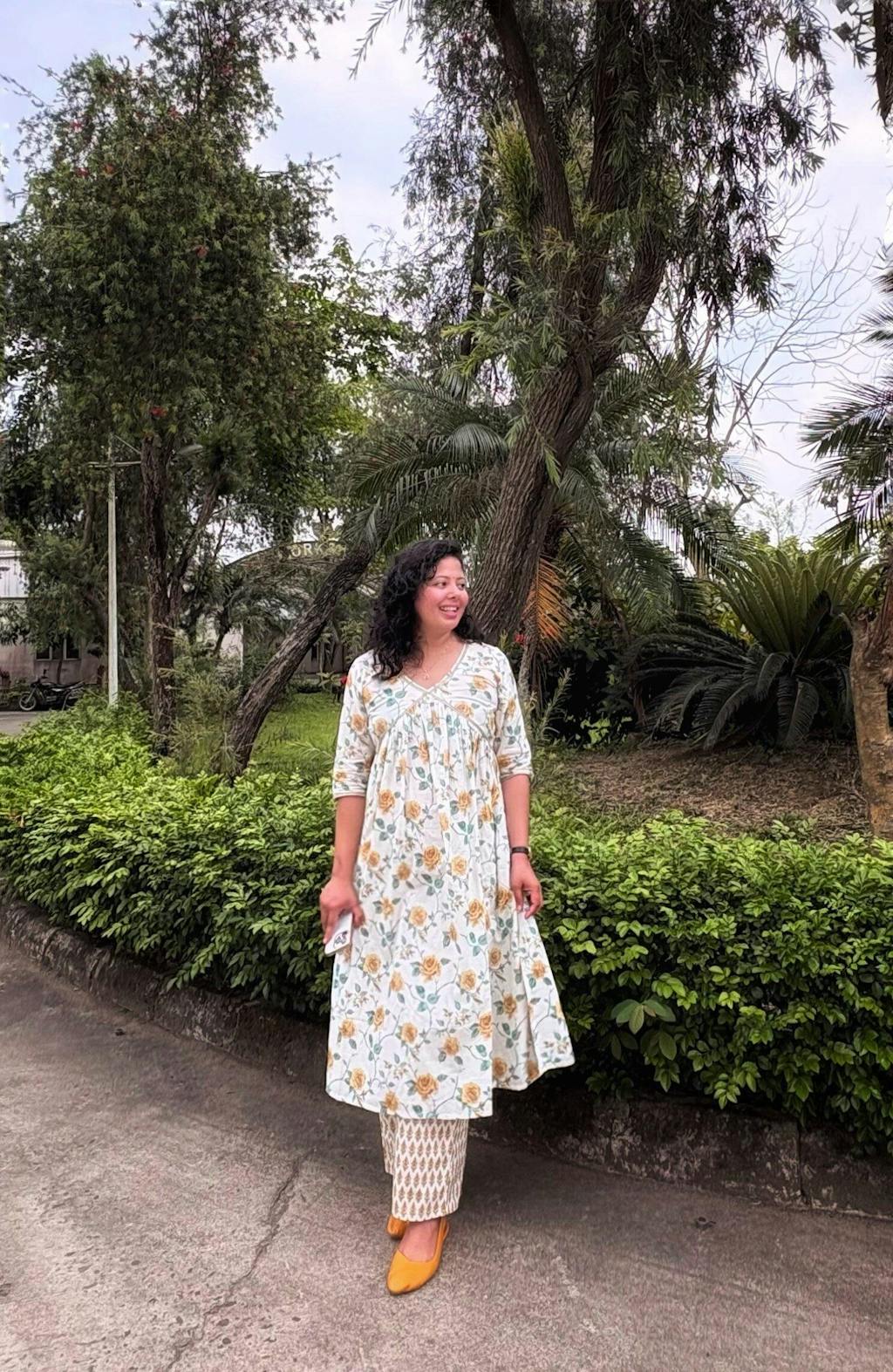 Our 2-piece off-white printed cotton kurta set features an A-line kurta with a V-neckline, three-quarter sleeves, pleated detailing, and high slits. Complemented with wide-legged trousers with a partially elasticated waistband. Highlighted with captivating floral prints and Gota Patti detailing, this style is perfect for casual outings.